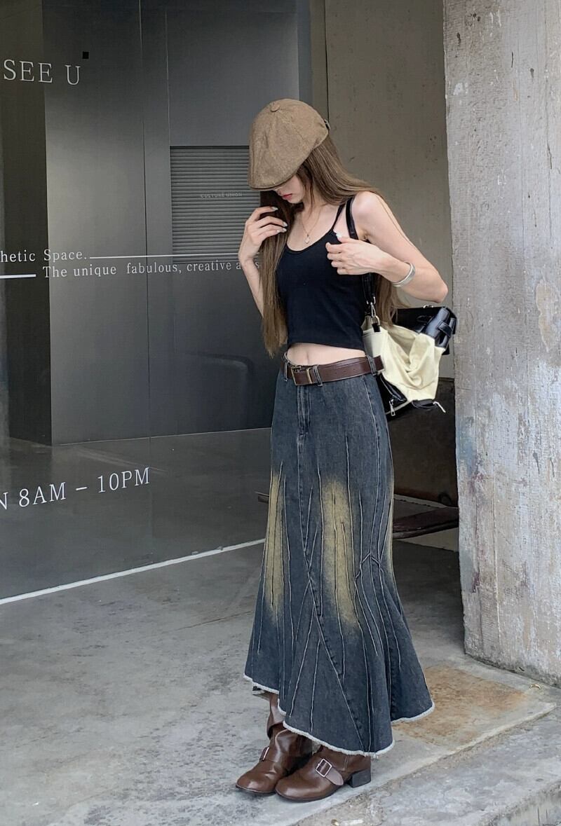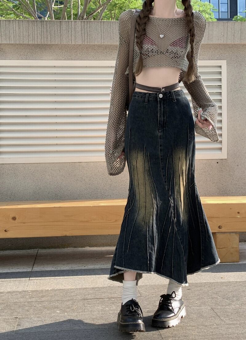 レトロダメージ加工ローエッジデニムスカートレディース秋デザインイレギュラースカートハイウエストヒップフィッシュテールロングスカート ハイウェスト オータム 秋物 bstraw13386049970 | beaute25
