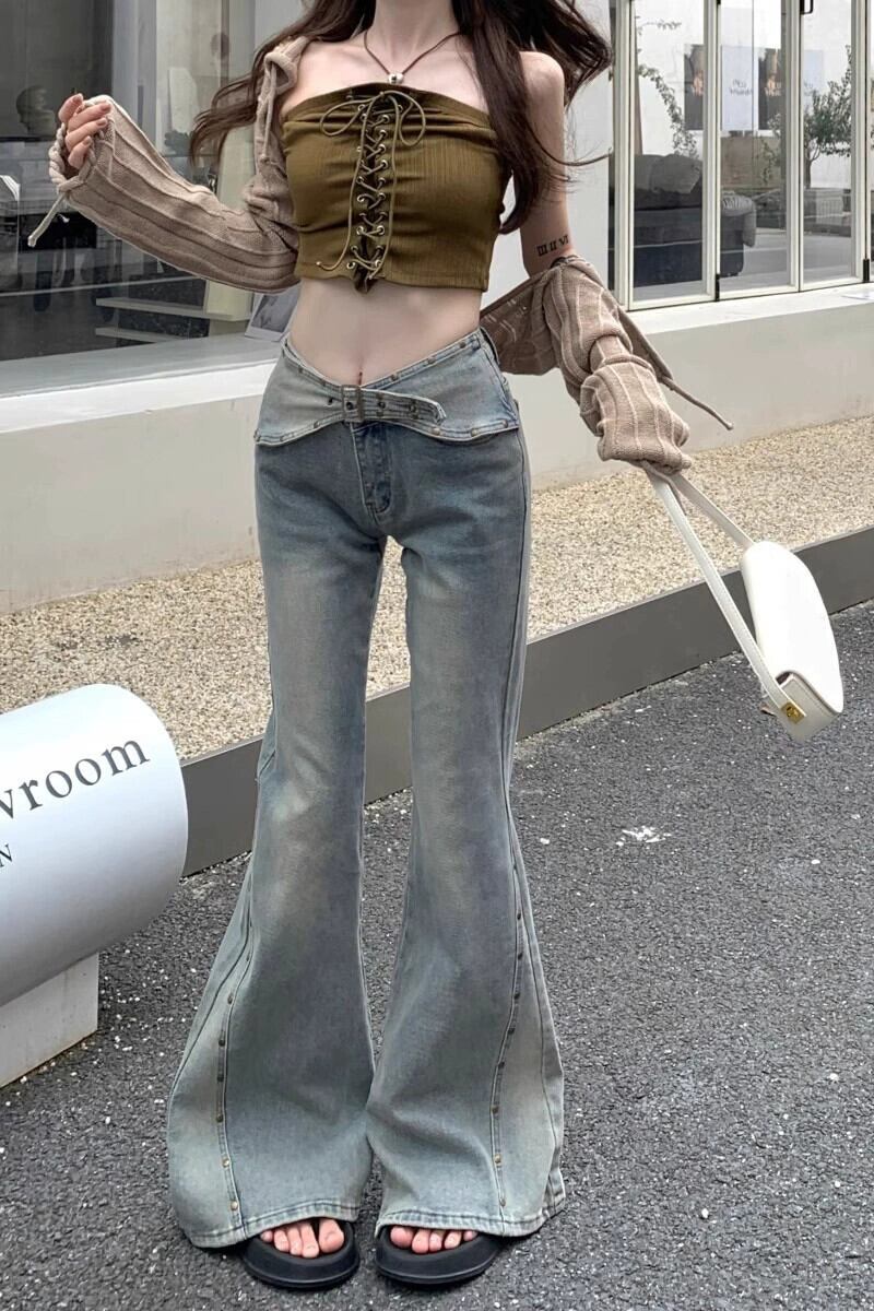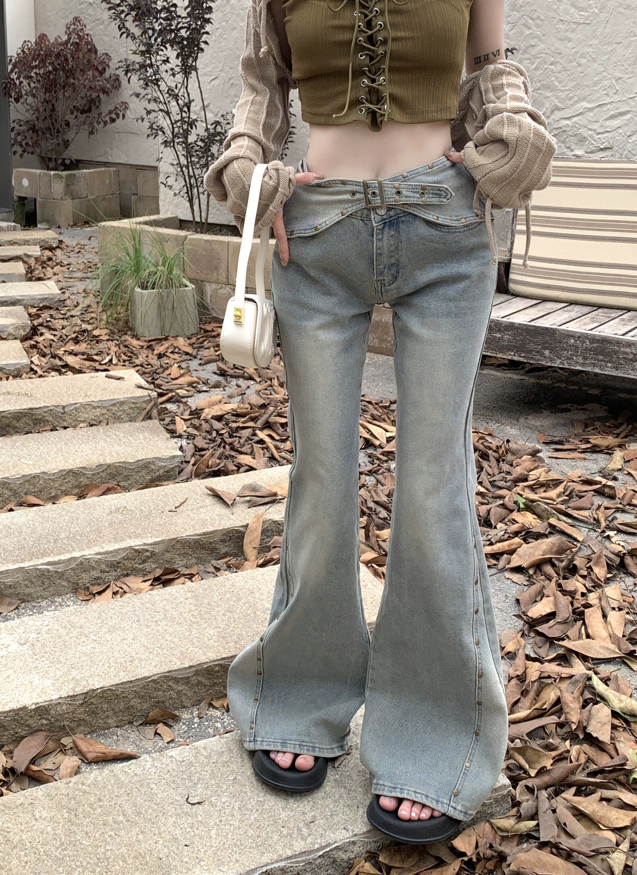 エド リベット スプライシング マイクロ フレア ジーンズ、秋の女性、小さなローウエスト ストレート パンツ、床までの長さのパンツ レッド オータム 秋物 bstraw81109940243 | beaute25