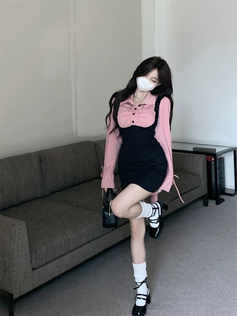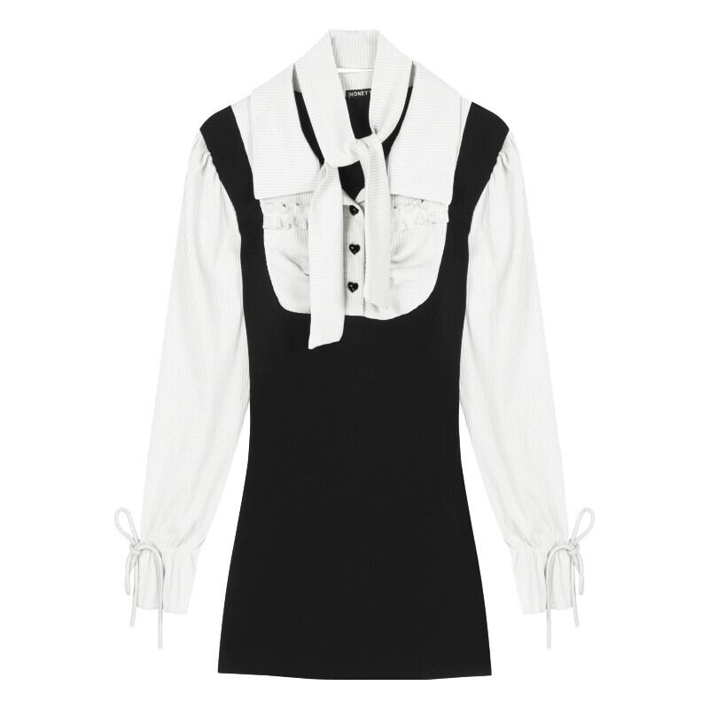 秋のホット長袖ドレス女性フェイクツーピース対照的な色のスプライシングスカート蝶ネクタイセクシーなヒップカバーショートスカート ロング リボン オータム 秋物 bstraw17070047301 | beaute25