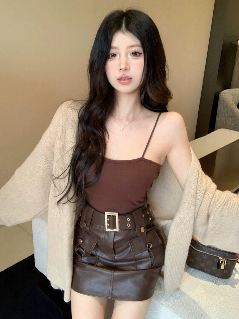 色:クリームアプリコットカーディガン,暖かいラテカーディガン,ブラウンスリング,ブラウンレザースカート
