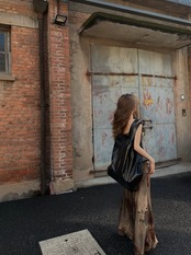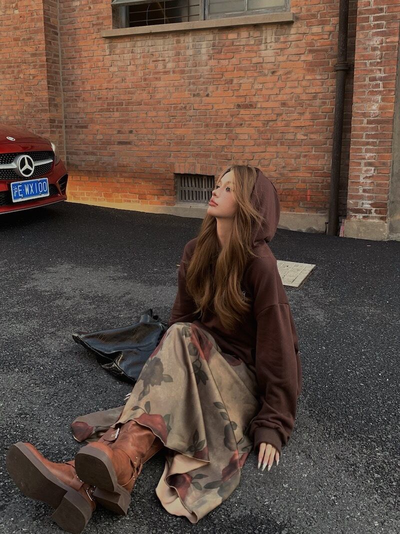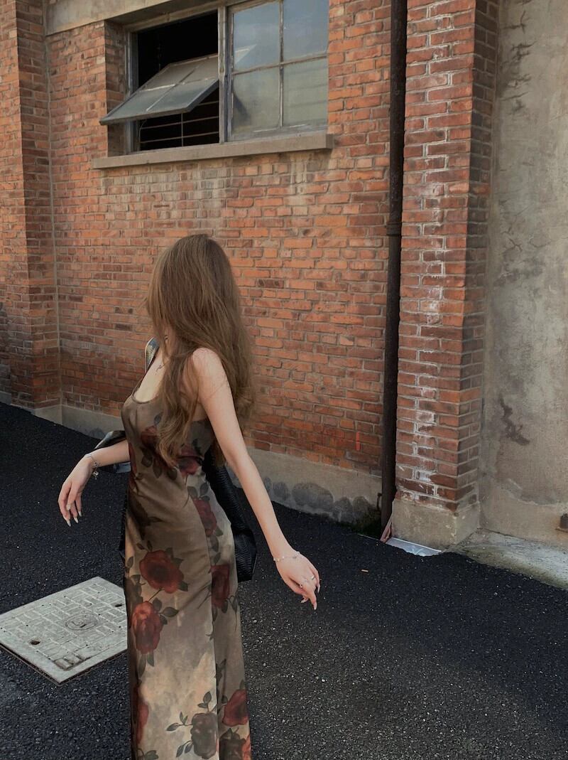 色:コーヒー色のセーター,ローズサスペンダードレス