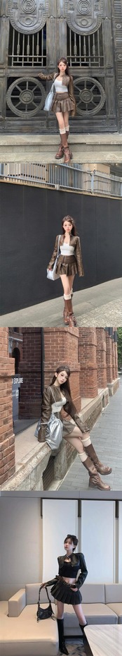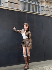 色:ブラウンジャケット,黒いジャケット,白いベスト,黒のベスト,ブラウンレザースカート,黒革のスカート