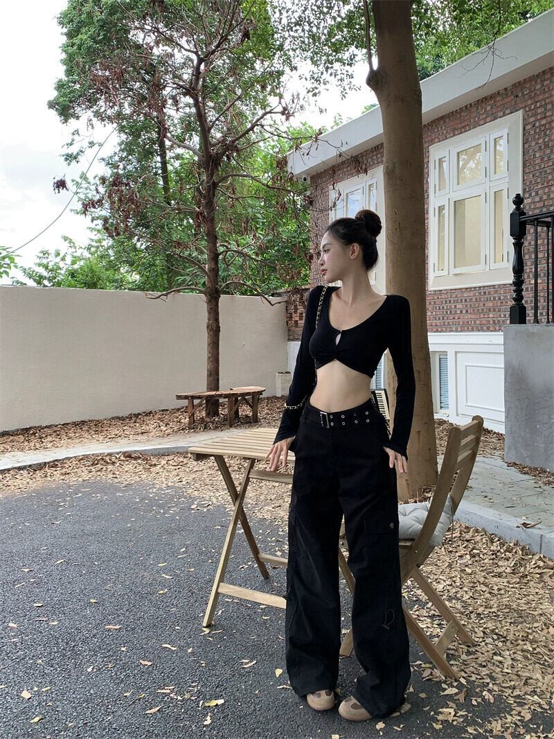 黒のセクシーな v ネック長袖底付け Tシャツ女性秋 2023 新しい bm スタイルスリムショートインナートップ ロング ブラック オータム 秋物 Vネック bstraw45851765008 | beaute25