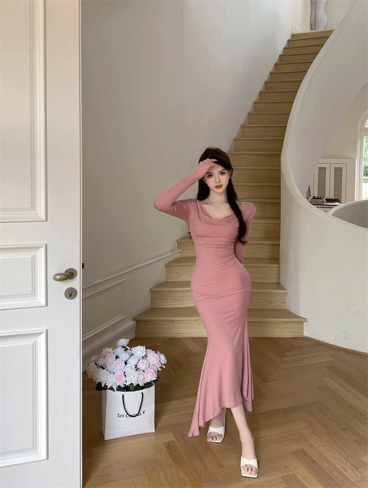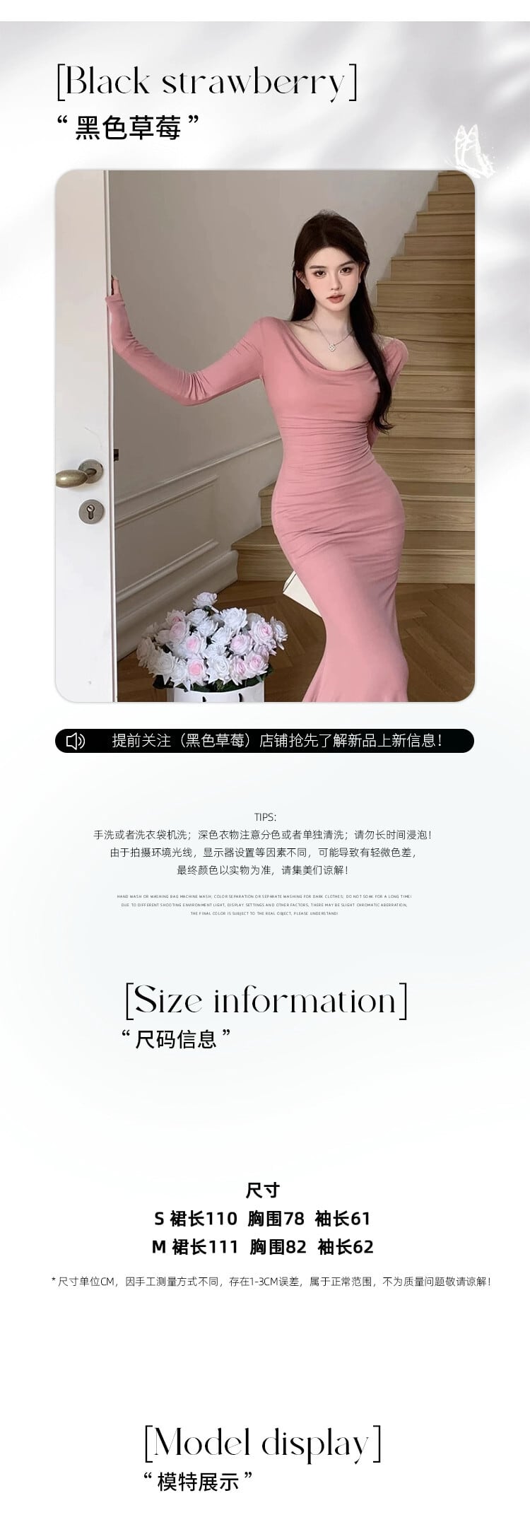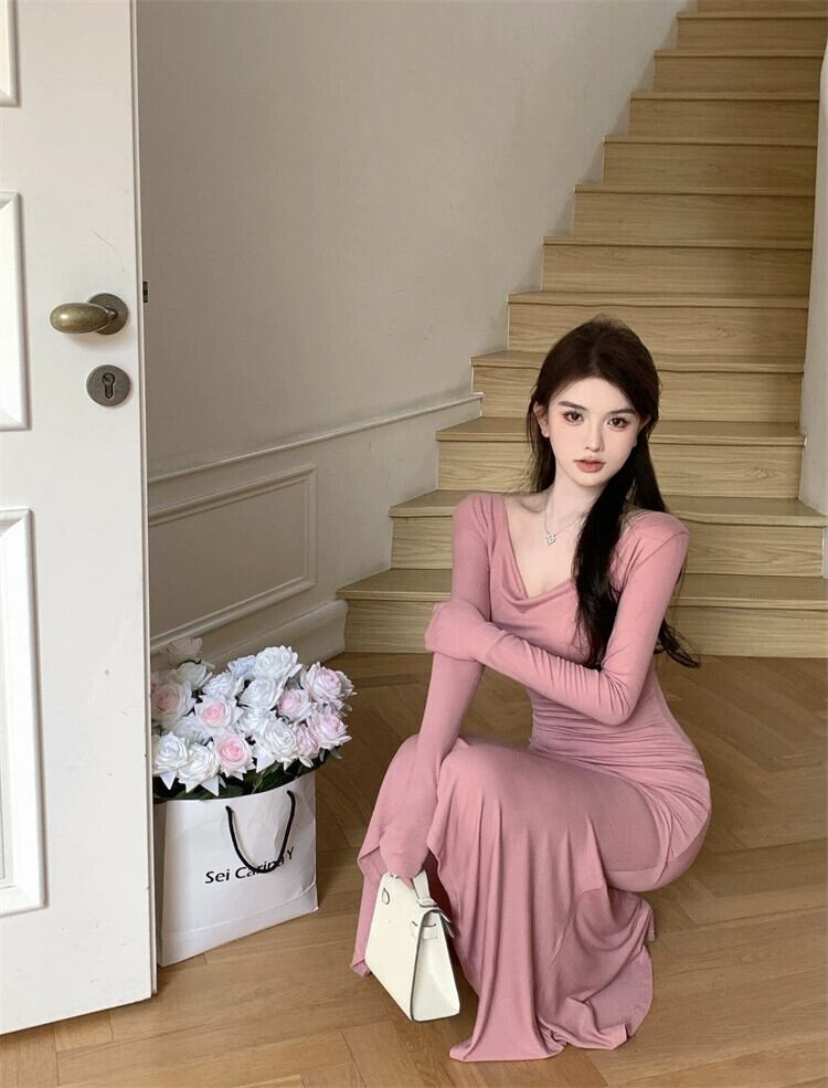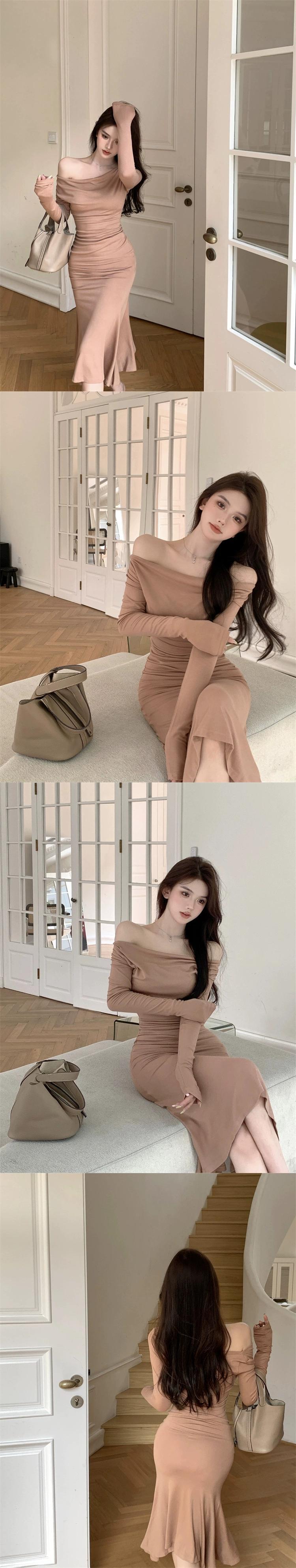 初秋のピンクのオフショルダースリムドレスの女性、長袖の純粋な欲望スタイルのスカート、ウエストバッグのお尻、フィッシュテールの不規則なロングスカート オータム 秋物 ピュア bstraw15902108086 | beaute25