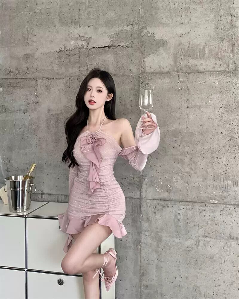 ピュアラストネクタイ長袖ホルターネックオフショルダードレスレディース秋ウエスト引き締めフラワースカートフリルお尻カバーショートスカート ロング オータム 秋物 フラワーデザイン bstraw6015230655 | beaute25