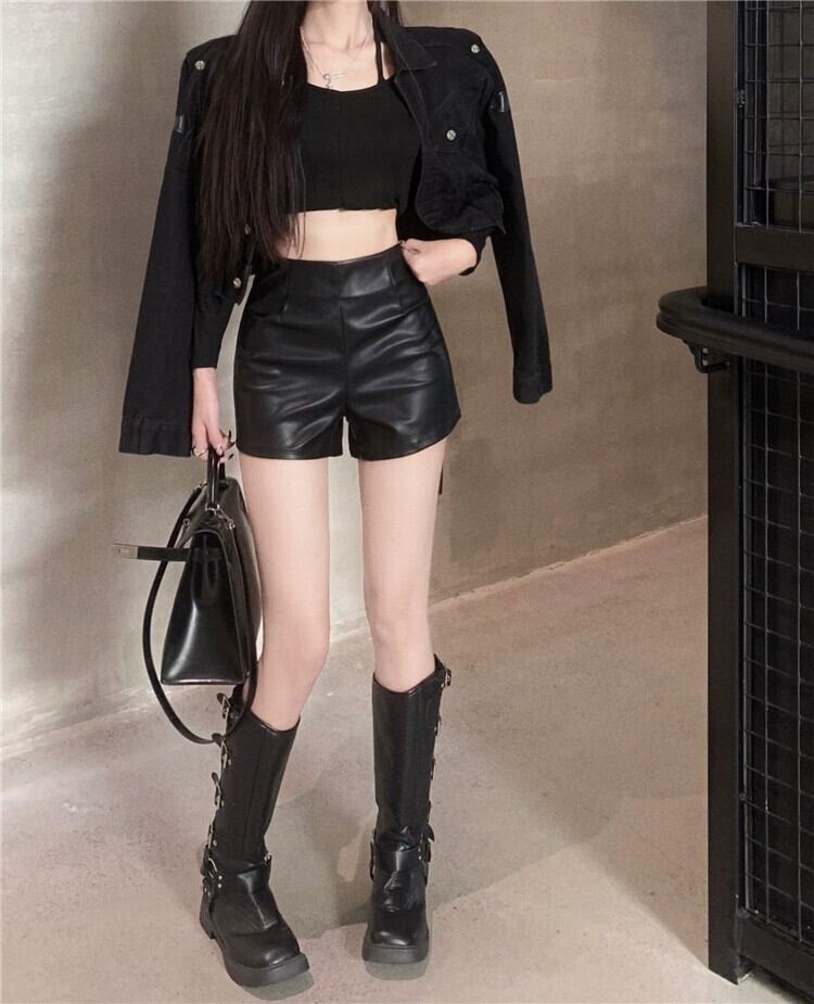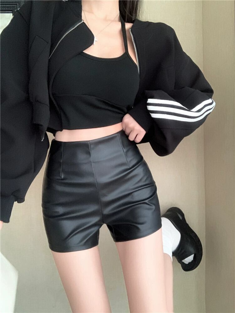 黒 pu レザーパンツカジュアルショートパンツ女性秋ハイウエストタイトストレートパンツセクシーな a ラインヒップカバーパンツ ハイウェスト ブラック オータム 秋物 ショーツ ブルマー Aライン bstraw93178498870 | beaute25