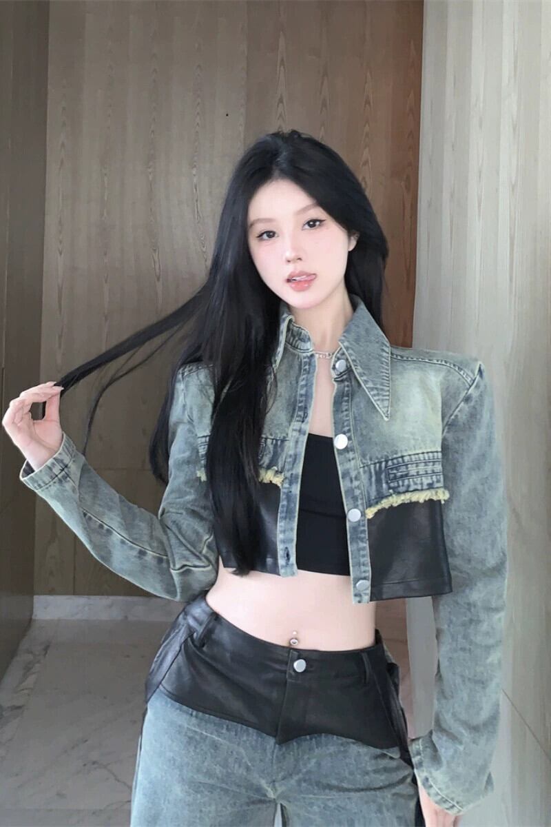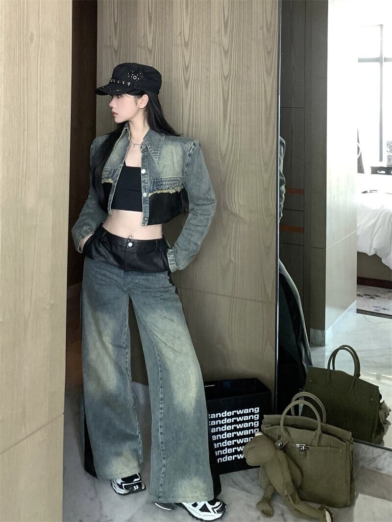 スプライシングデニムスーツレディース秋レトロショートトップコートハイウエストワイドレッグパンツ2点セット ハイウェスト オータム 秋物 ワイドパンツ bstraw68905883623 | beaute25