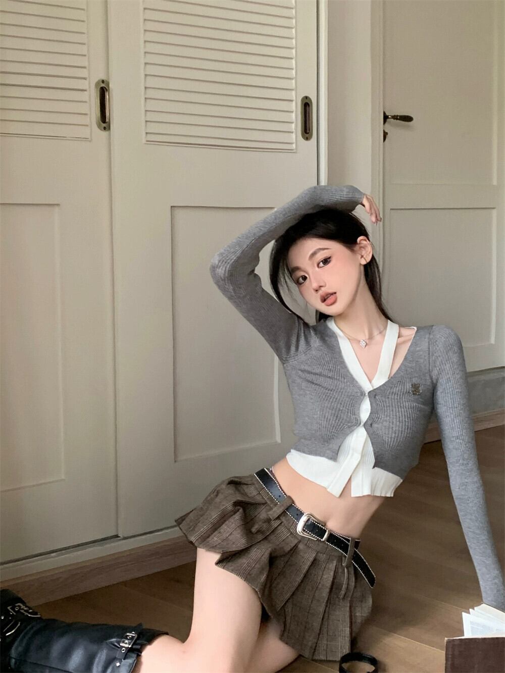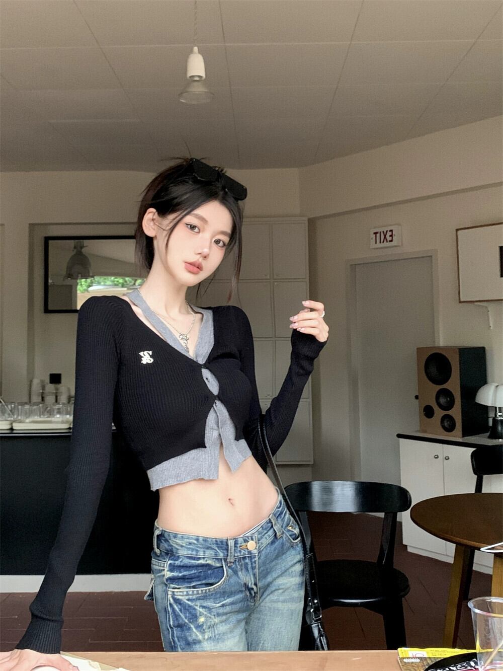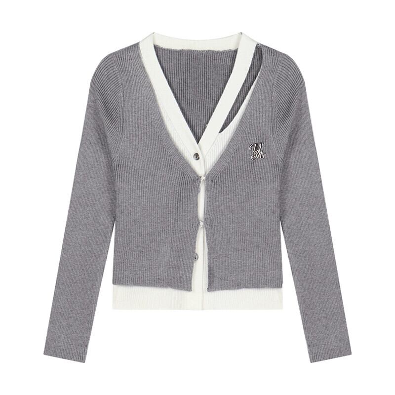 グレーのスリムフィット短い気質の V ネックニットカーディガン秋の女性のフェイクツーピース対照的な色の長袖アウタートップ ショート ロング オータム 秋物 Vネック bstraw9533682545 | beaute25