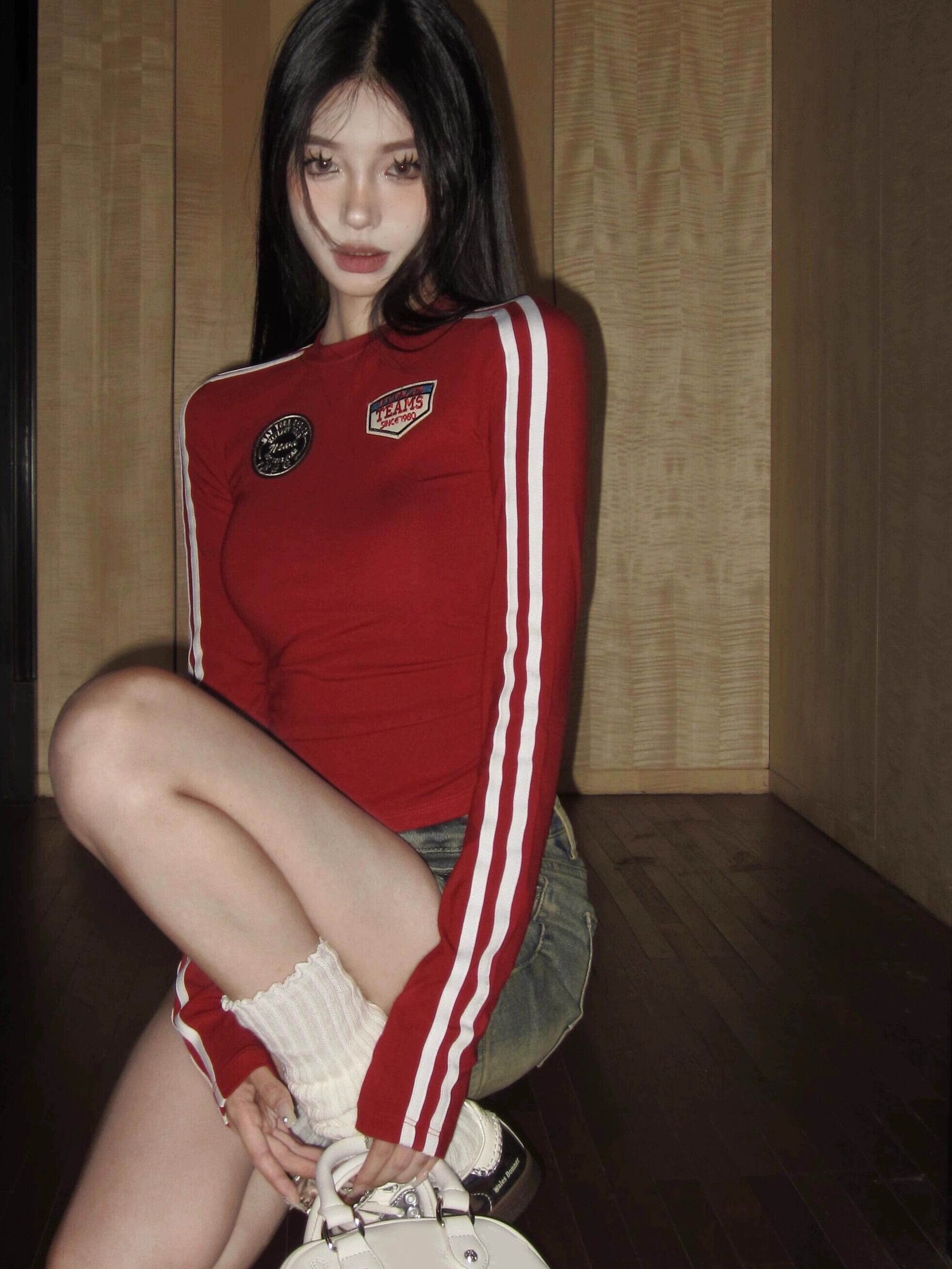レトロな赤刺繍長袖 Tシャツの女性の秋のタイトフィットボトリングシャツアメリカンセクシーなスリムショートトップ ロング レッド オータム 秋物 bstraw57030930869 | beaute25