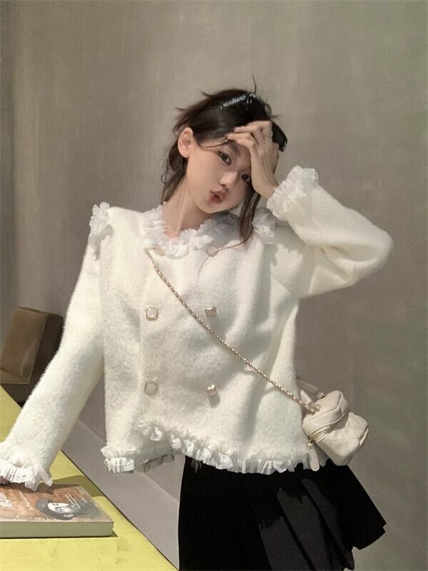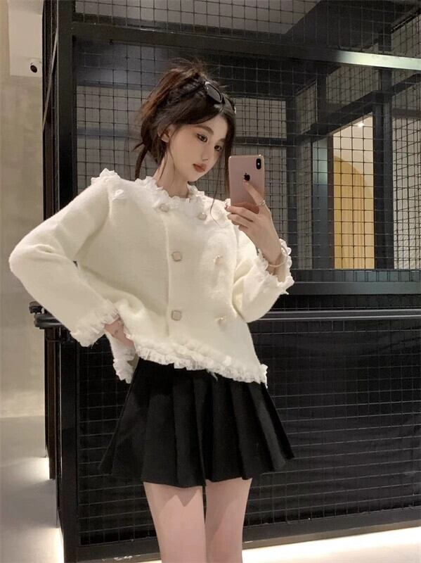 秋の白い小さな香りのよいスタイルのセータージャケット女性、穏やかな菌ステッチ模造ミンクベルベットニットカーディガントップ ホワイト オータム 秋物 bstraw43704668621 | beaute25