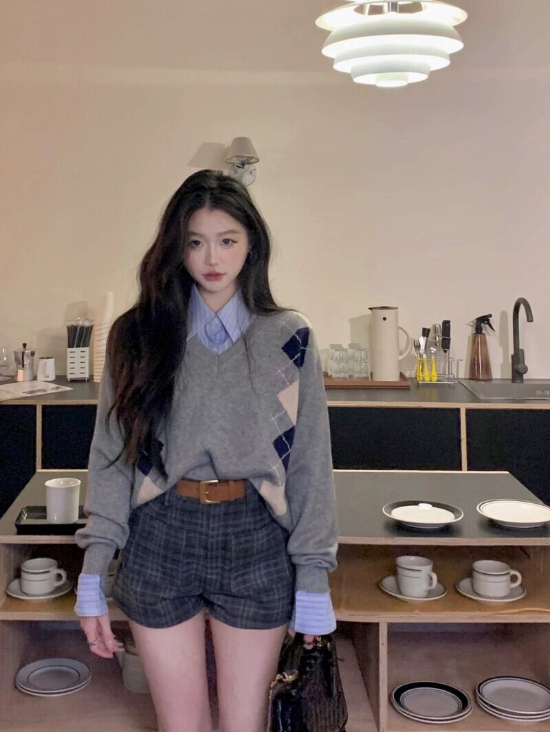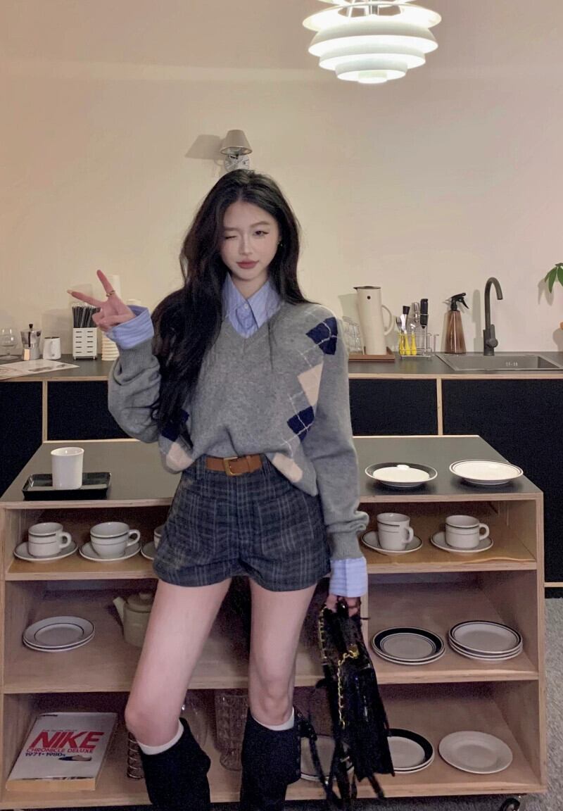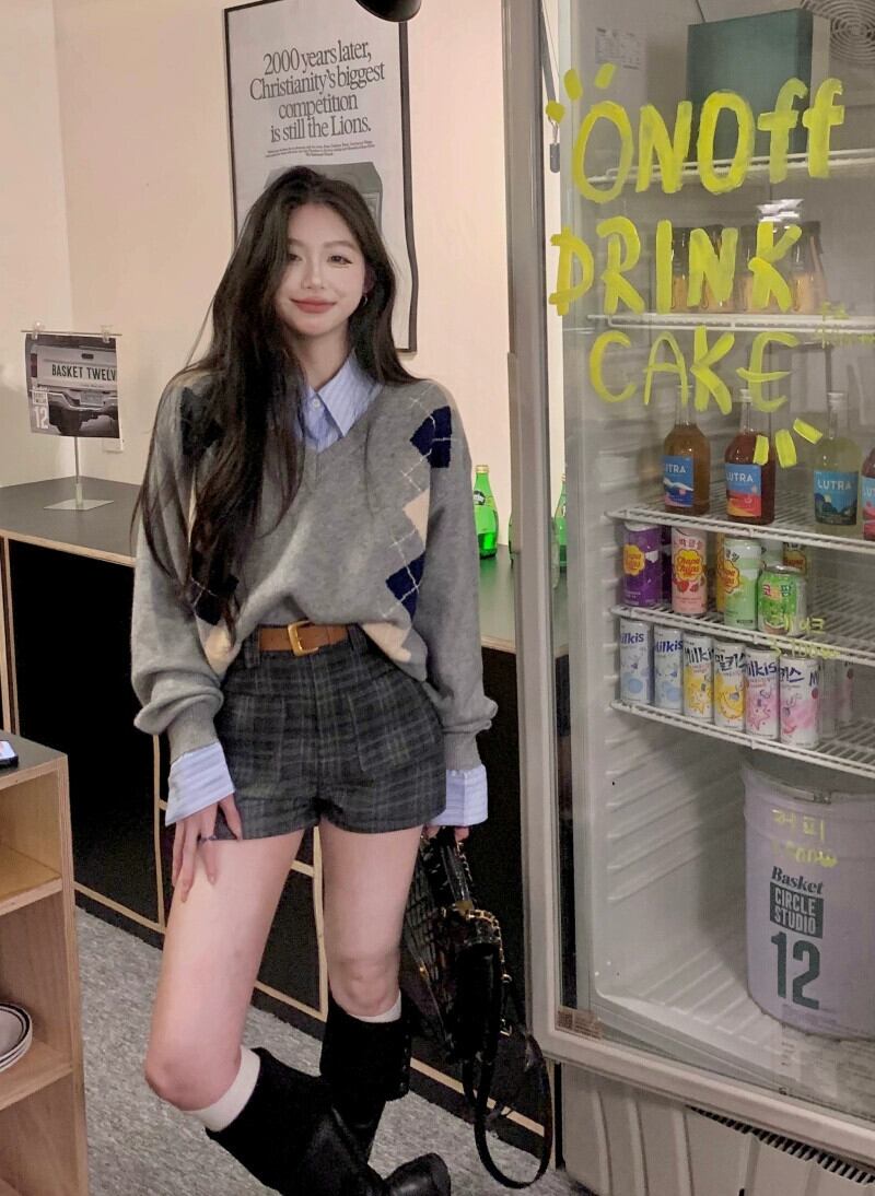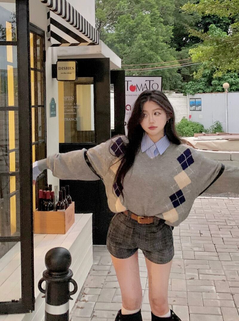 色:フラワーグレーセーター,青いシャツ,ベルト付きチェック柄ショーツ