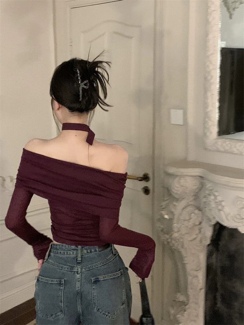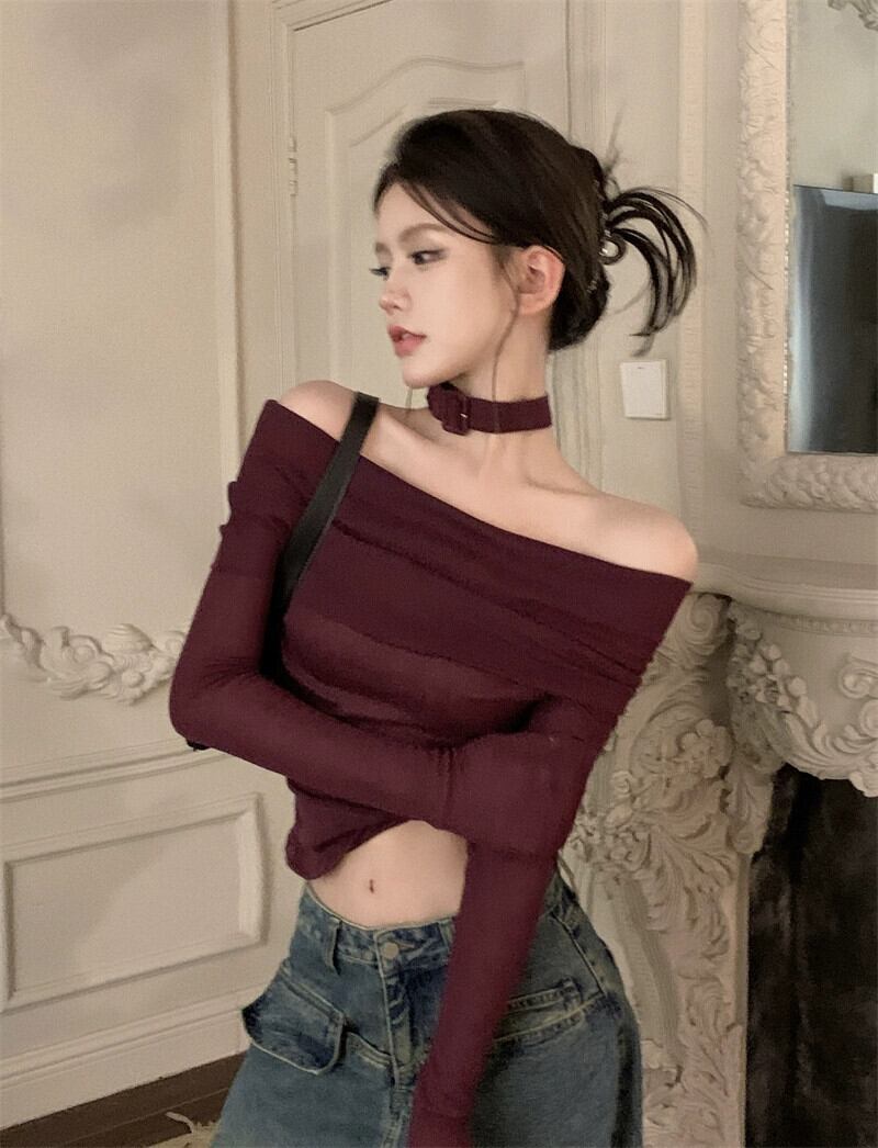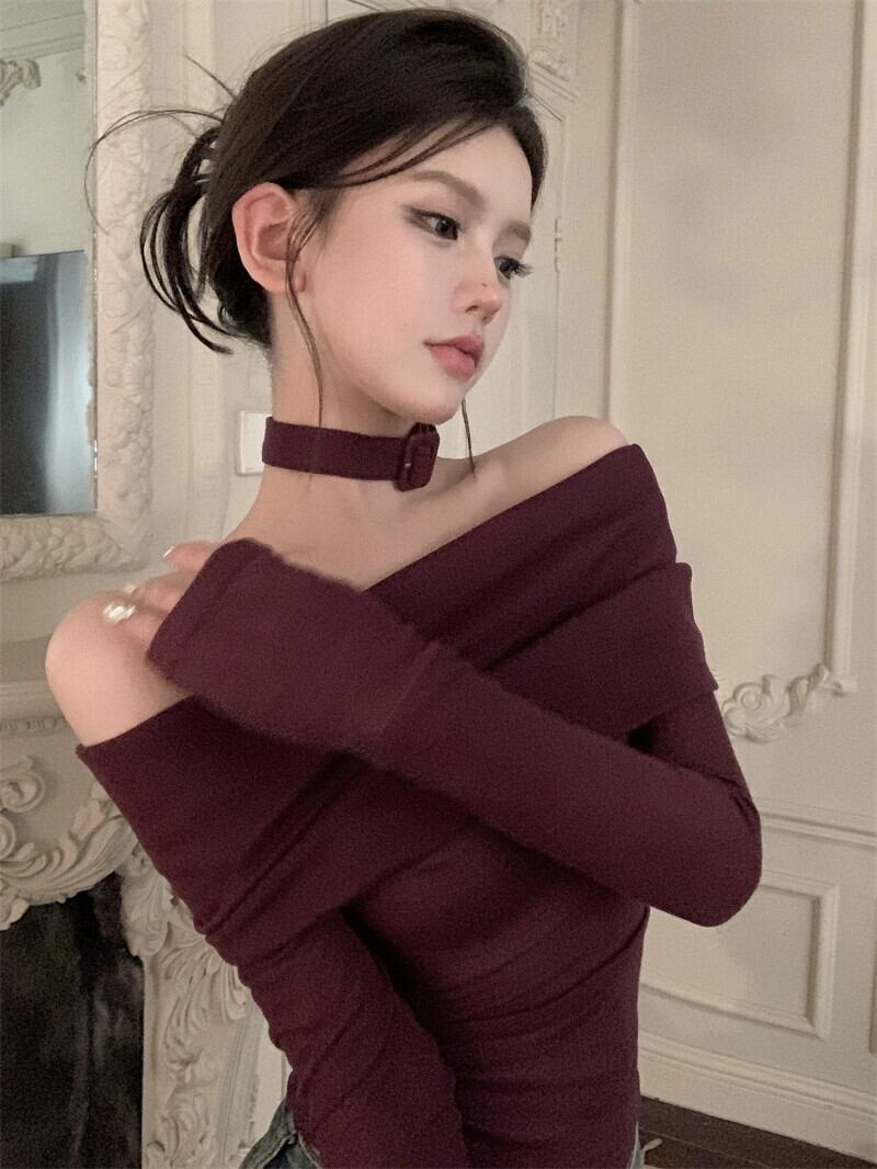秋のセクシーなワンショルダー長袖ニット T シャツの女性、純粋な欲望ネクタイ鎖骨オフショルダー スリム ショート ボトム トップ ロング オータム 秋物 Tシャツ ピュア bstraw25734774942 | beaute25