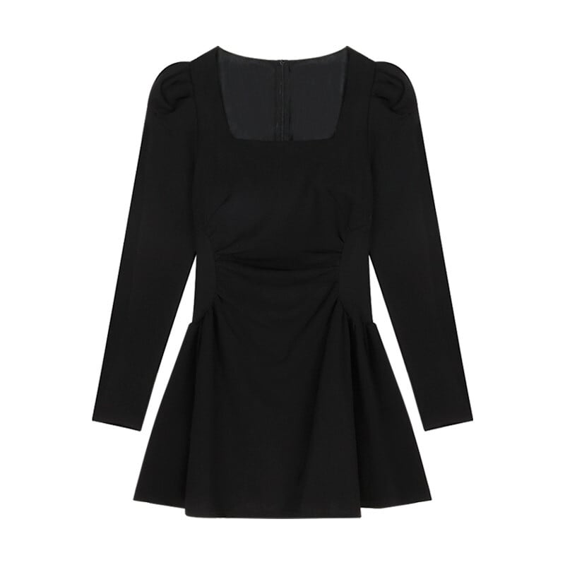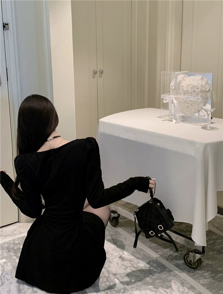 フレンチレトロスクエアネックドレス女性の秋パフ長袖リトルブラックドレスウエスト A ラインショートスカート気質スカート ロング オータム 秋物 Aライン スクウェア bstraw50687859919 | beaute25