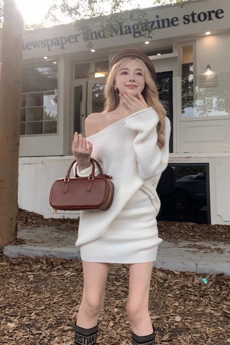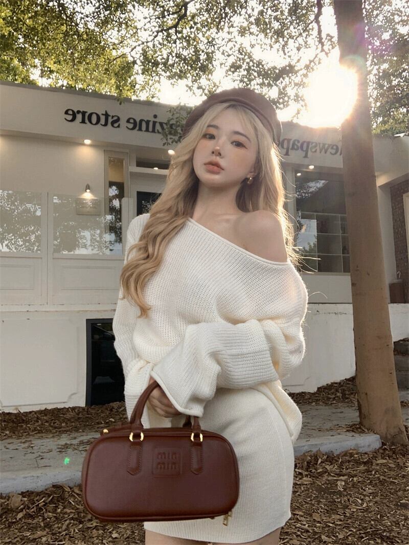 胸型優しいコーデセット ワンショルダー セーター トップス レディース 秋ニット ヒップカバースカート ショートスカート 2点セット オータム 秋物 bstraw94175538237 | beaute25