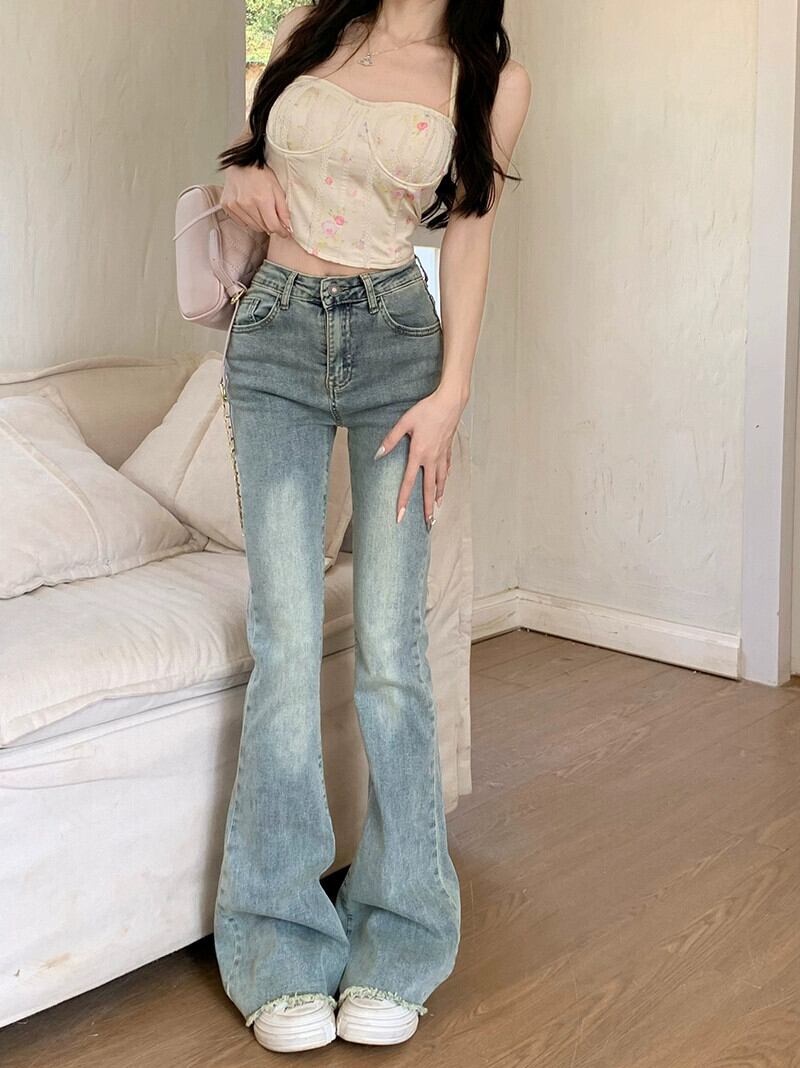 秋のレトロなウォッシュ ライトブルー ジーンズの女性のハイウエスト スリムフィット ストレッチ パンツ、切りっぱなしのエッジとわずかにフレアした床までの長さのパンツ レッド オータム 秋物 bstraw36573152661 | beaute25