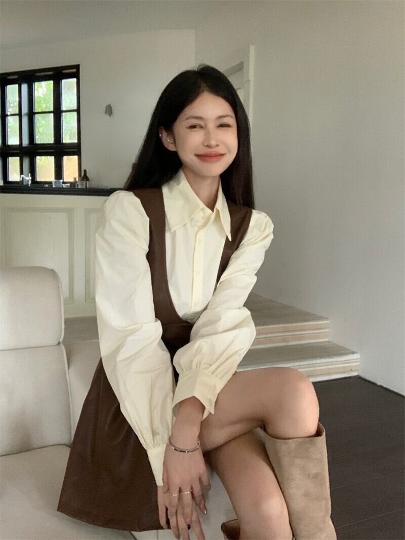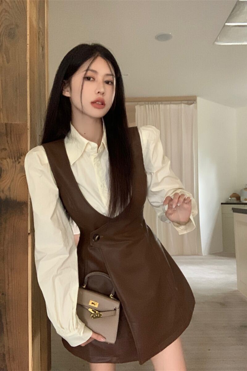 色:アプリコットシャツ,白のシャツ,コーヒー色のレザースカート,黒革のスカート
