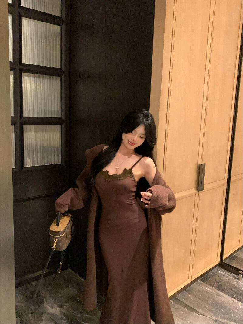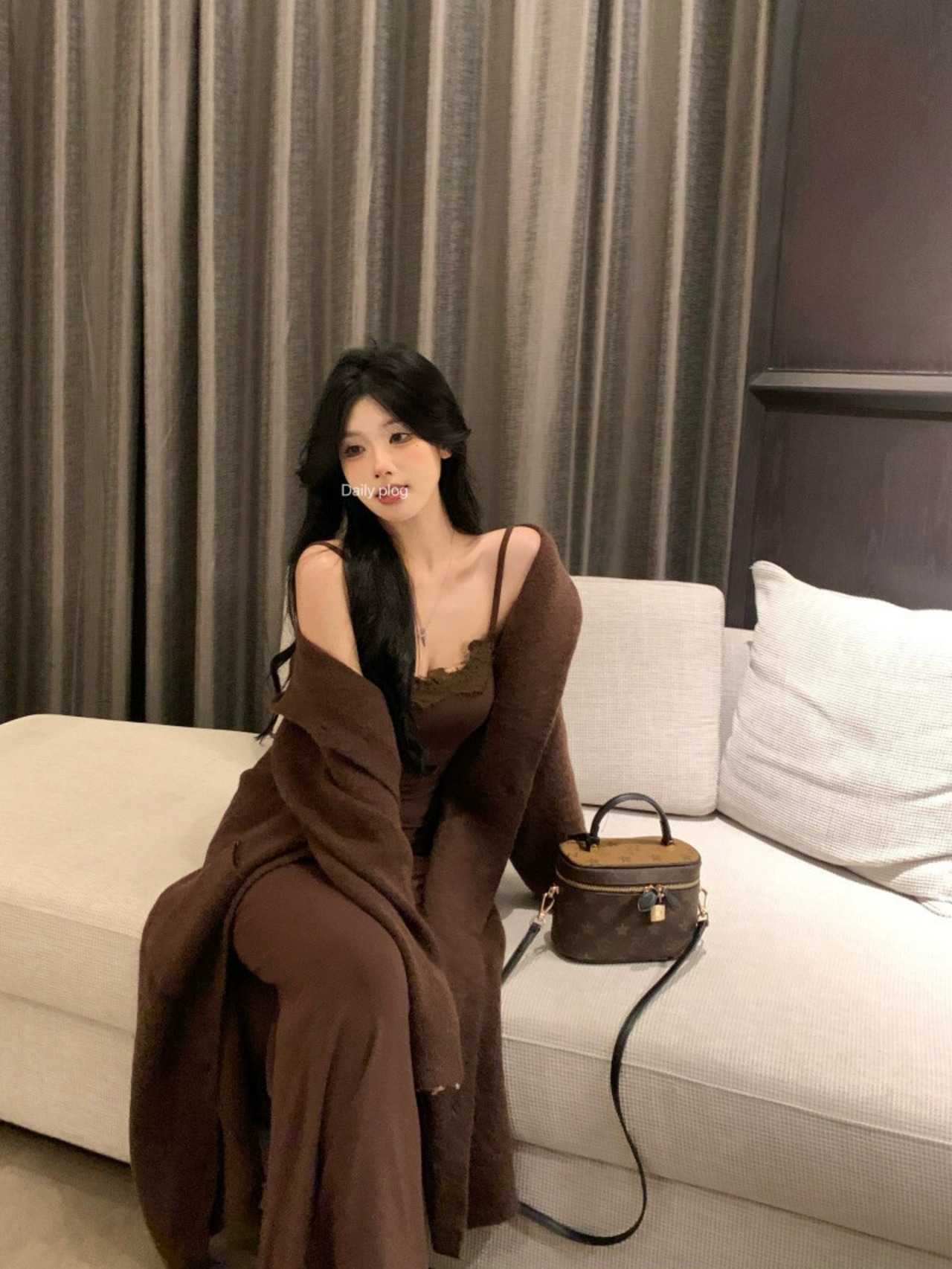 メイラードは、秋と冬に茶色のセーター ジャケット、怠惰なスタイル、ゆったりとしたミドル丈のニット カーディガン トップを着ています。 オータム 秋物 ウィンター 冬物 bstraw65899380639 | beaute25