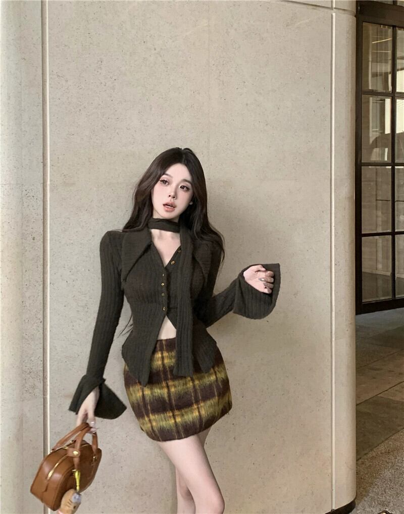 Pure Desire 長袖 V ネックニットセーターカーディガン女性の秋のスーツチェック柄ヒップショートスカート 2 点セット ロング オータム 秋物 Vネック bstraw33753093291 | beaute25