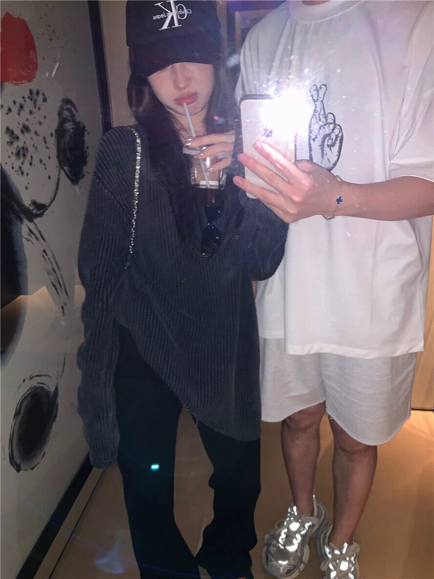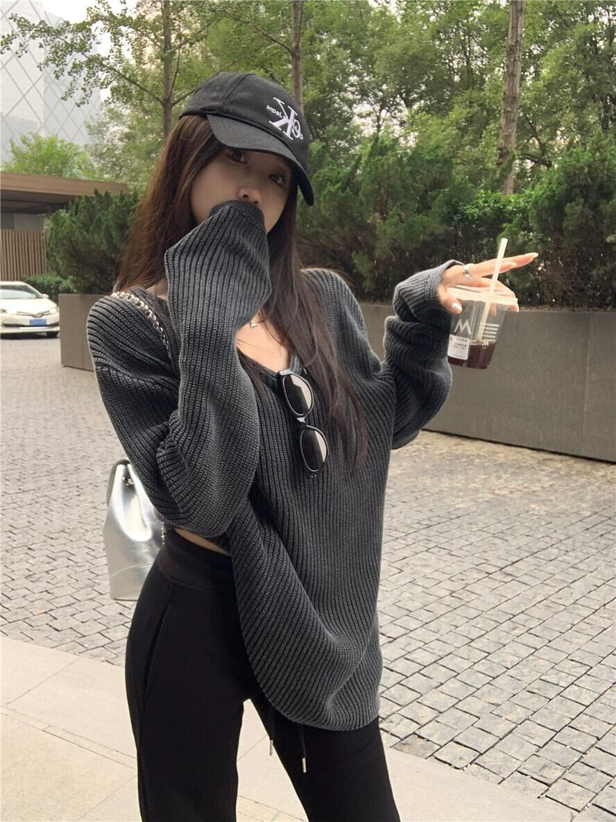 ダークグレーのゆったりとした怠惰なスタイルのニットセーター女性の秋の V ネックコート長袖ミッドレングスお尻をカバーするトップ ロング オータム 秋物 Vネック bstraw1217034667 | beaute25