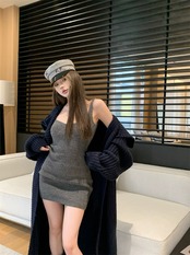 色:グレーのドレス,ブローチ付きブルーのカーディガン