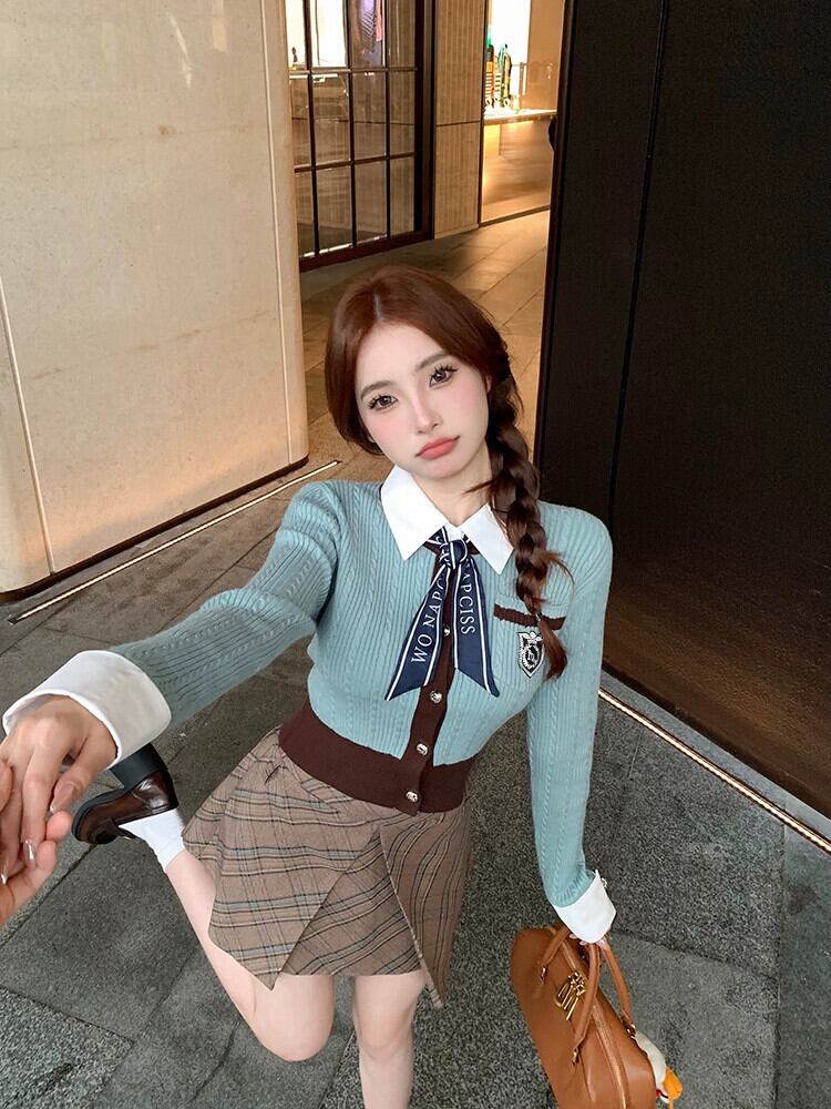 色:パープルトップ,ベージュトップ,ミントグリーントップ,チェック柄スカート,ネクタイ