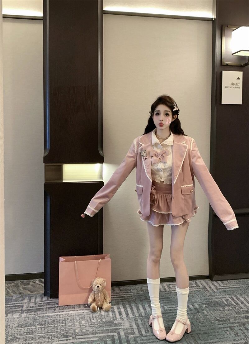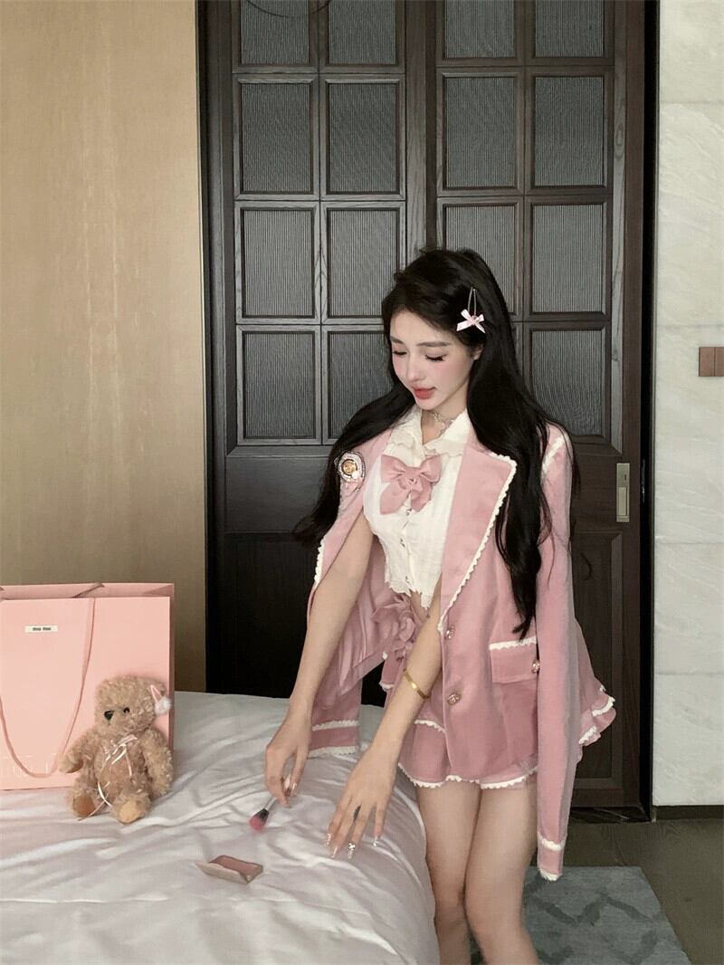 ピンクのスーツジャケット半袖シャツトップドラマ衣装女性秋甘いネクタイスカート 3 点セット 大人ガーリー スウィート キュート カジュアル オータム 秋物 bstraw84028976770 | beaute25
