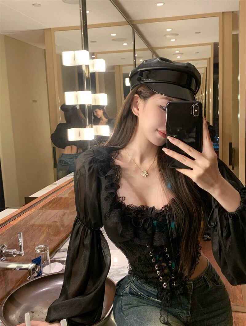 フランスの雰囲気のランタンスリーブシャツ女性秋ウエストフィッシュボーンショートシャツ純粋な欲望スタイルレースシフォントップ オータム 秋物 ピュア bstraw35420718914 | beaute25