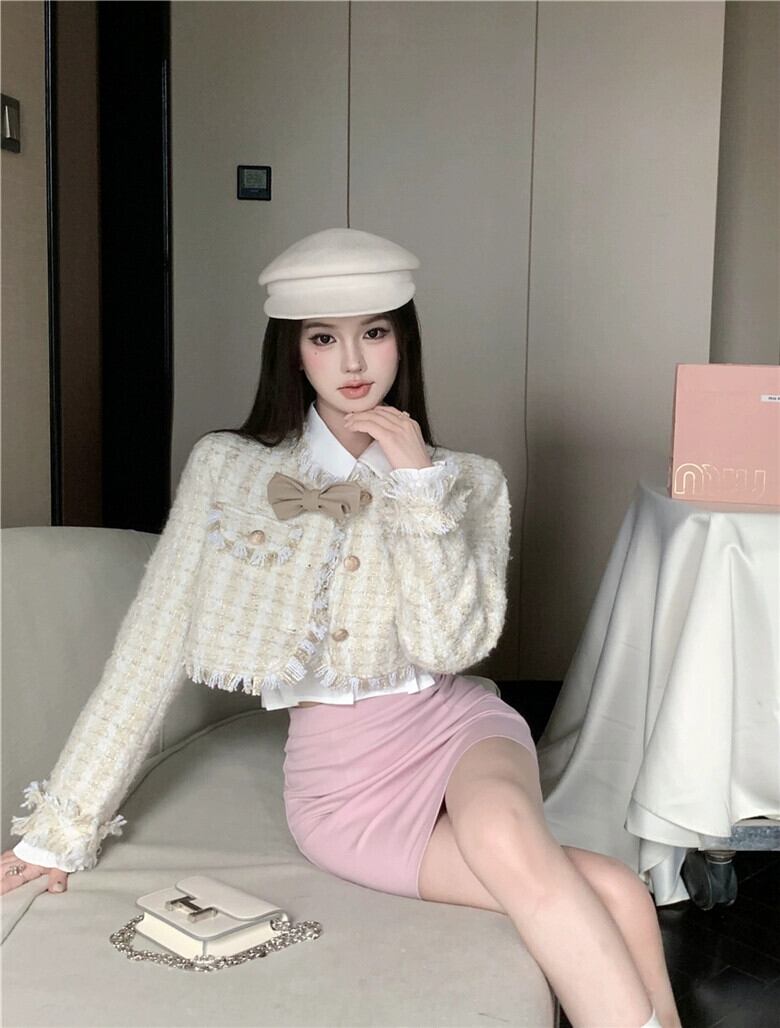 色:ネクタイと白いシャツ,クリーミーな白いコート,ピンクバッグヒップスカート
