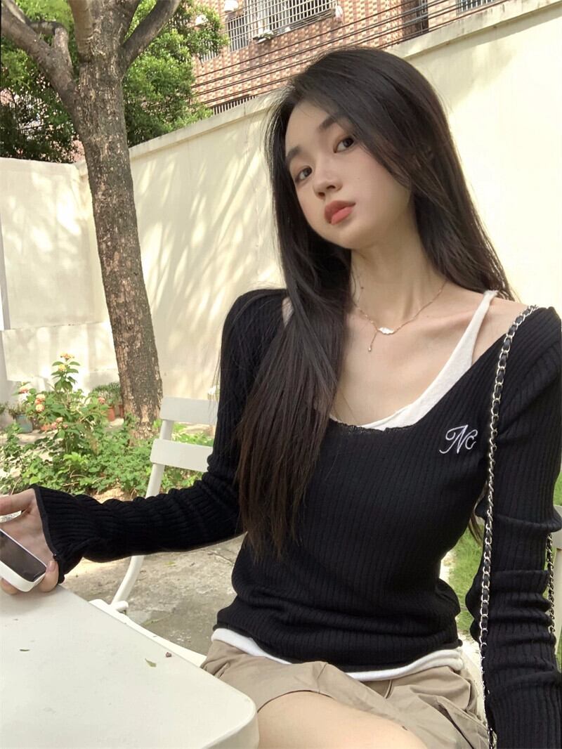 秋スタイルのフェイクツーピース長袖ホルターネックセーター女性、コントラストカラーのスプライシングアウタートップが付いたシックなスリムフィットボトムシャツ ロング オータム 秋物 bstraw91185000158 | beaute25