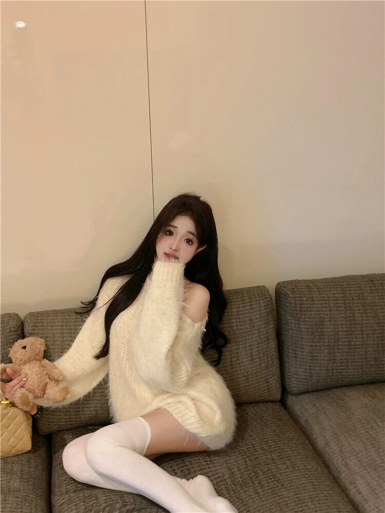 優しく純粋な欲望ミンクセーター女性の秋と冬ルーズレイジースタイル長袖オフショルダーソフトワックスニットウェアトップアウター ロング オータム 秋物 ウィンター 冬物 ピュア bstraw48675204909 | beaute25