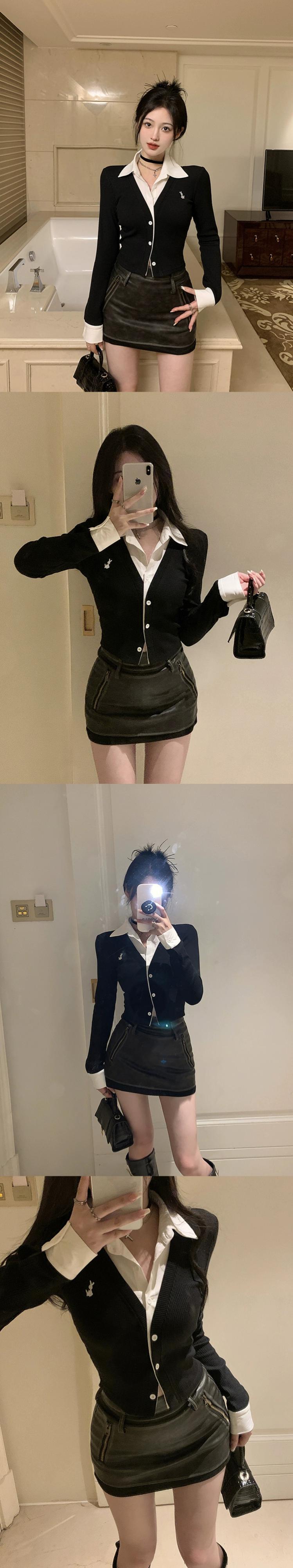 ポロカラー刺繍長袖ニットカーディガン女性の秋のデザインシャツスプライシングスリムショートフェイクツーピーストップ ロング レッド オータム 秋物 bstraw20124829074 | beaute25