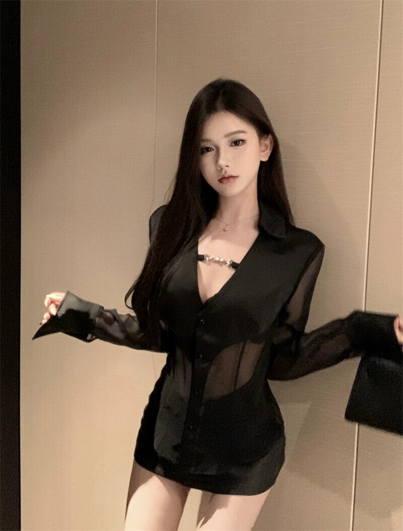 黒の V ネック長袖シャツ女性の秋のサテンパッチワークウエストシャツ純粋な欲望セクシーなシースルーメッシュトップ ロング ブラック オータム 秋物 Vネック ピュア bstraw82520682416 | beaute25