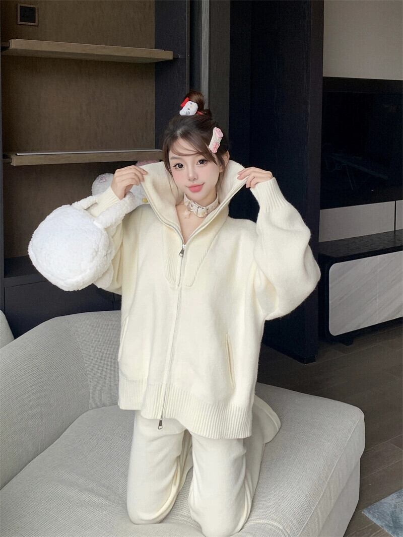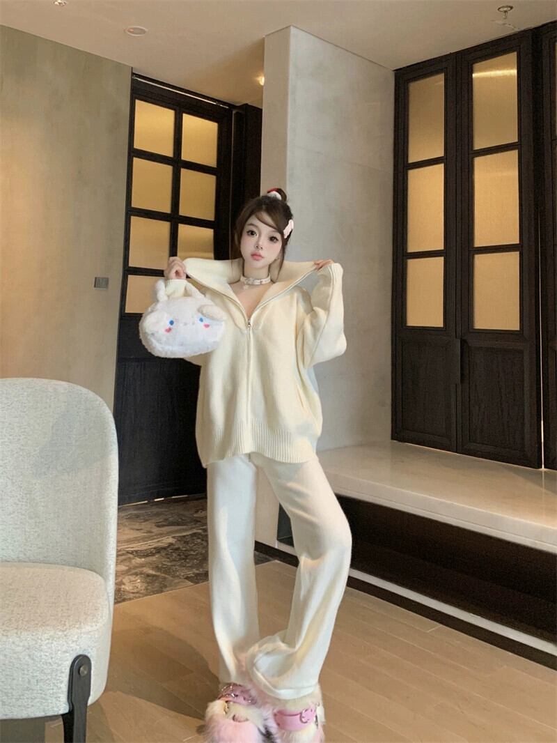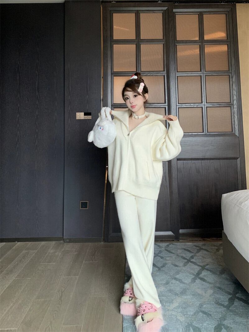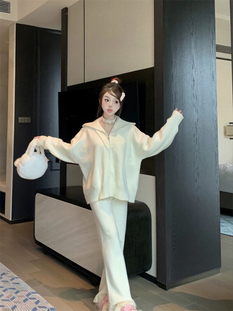 胸スタイル優しいスタイルの衣装セットルーズセータージャケットレディース秋カジュアルワイドレッグパンツニットツーピースセット オータム 秋物 ワイドパンツ bstraw77447501690 | beaute25