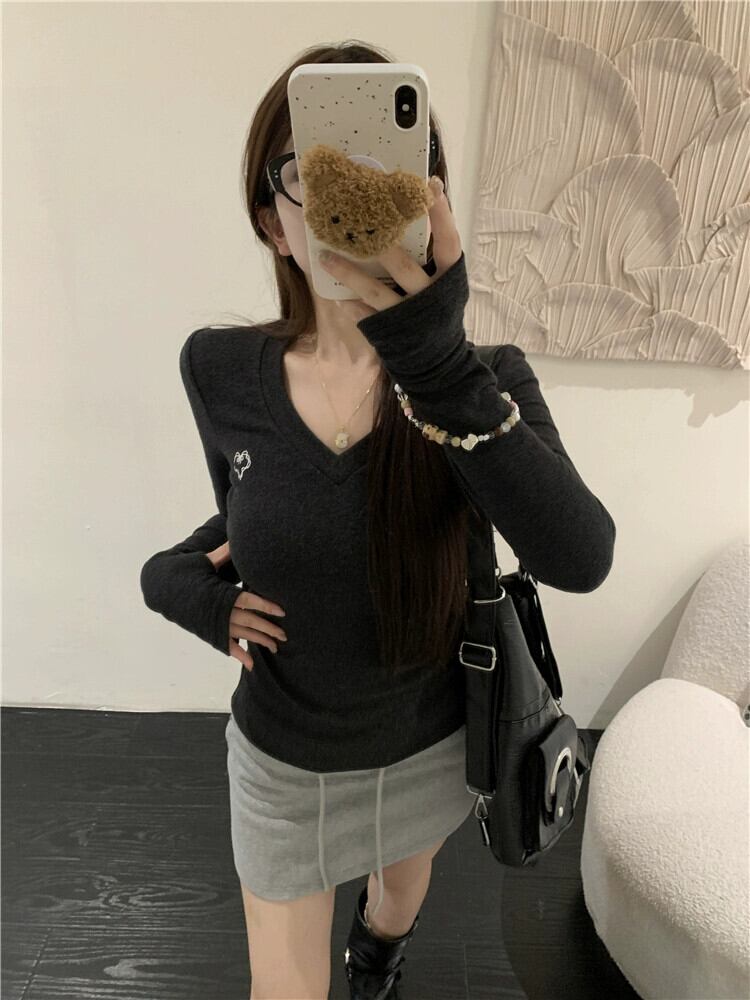 ラブ刺繍 V ネック Tシャツ女性の秋と冬のソリッドカラー長袖ボトムシャツスリムでタイトなドイツベルベット暖かいインナートップ ロング レッド オータム 秋物 ウィンター 冬物 Vネック bstraw86739948933 | beaute25