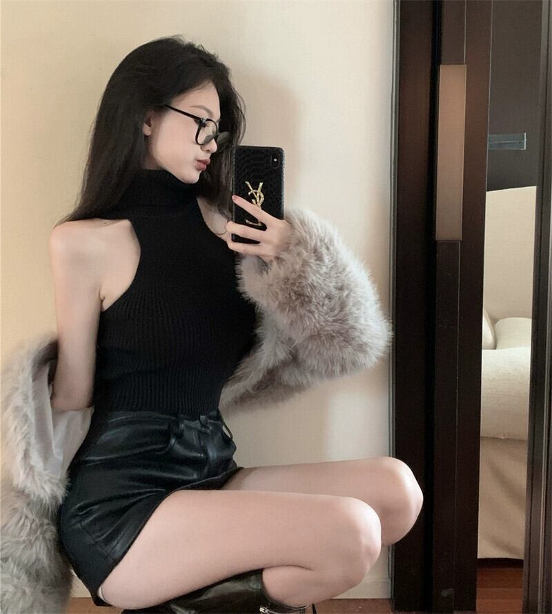 黒タートルネックセクシーなノースリーブセーター女性初秋 2023 新しいスリムフィット弾性ショートベストボトミングトップ ブラック エラスティック 伸縮 オータム 秋物 bstraw7854244394 | beaute25