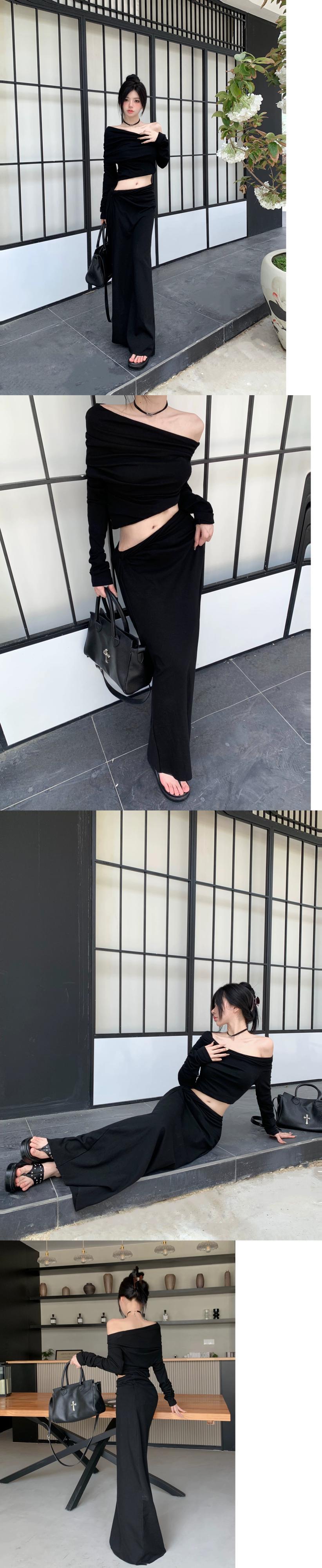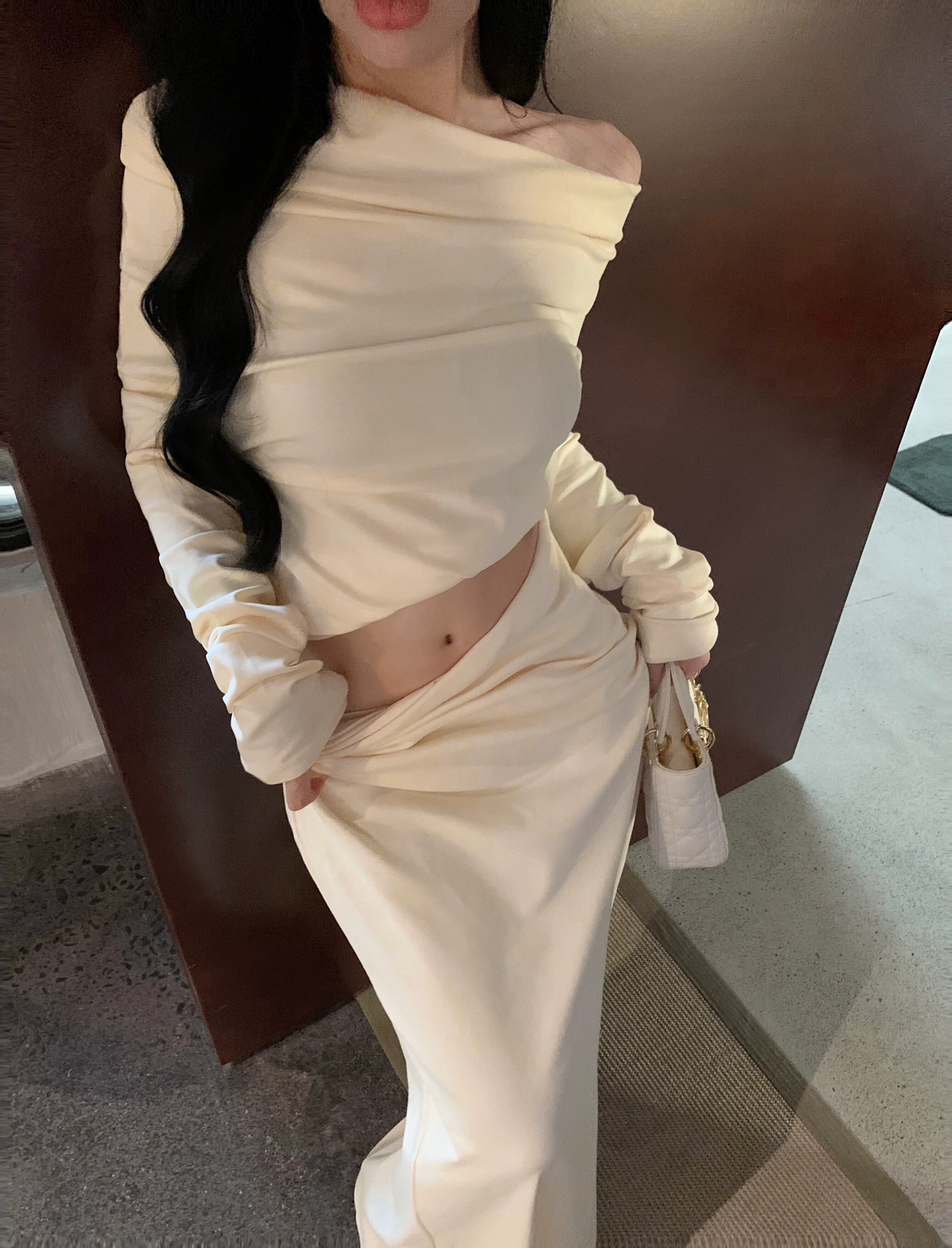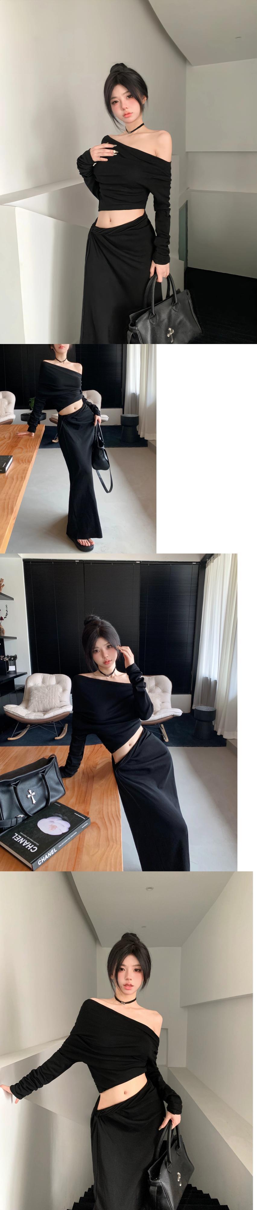 Yujie ワンショルダー長袖トップスとヒップカバーフィッシュテールミドル丈スカートの初秋の女性の軽い大人スタイルのスーツのツーピースセット ロング オータム 秋物 bstraw90247820746 | beaute25
