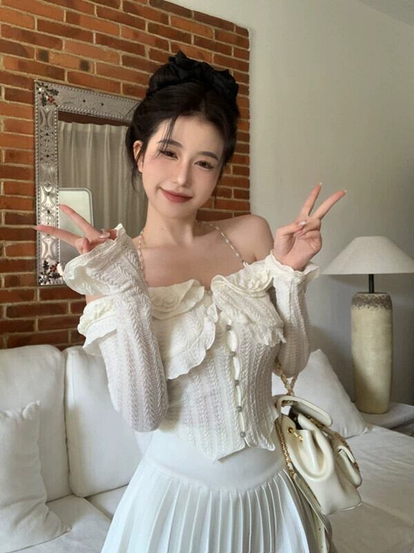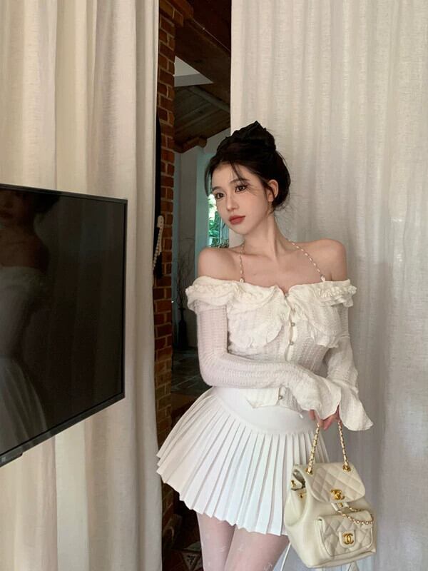 秋の純粋な欲望の白いワンショルダー長袖シャツの女性のホルターネックフリルデザインニッチショートシャツトップ ロング ホワイト オータム 秋物 ピュア bstraw32116861465 | beaute25