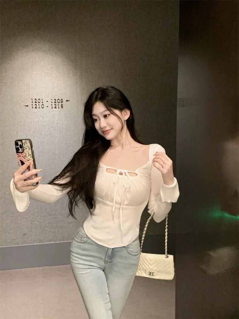 純粋な欲望白スクエアネック長袖セーター女性秋と冬のセクシーなショートボトシャツストラップとボディシェイピングトップ ロング ホワイト オータム 秋物 ウィンター 冬物 スクウェア bstraw28197608812 | beaute25