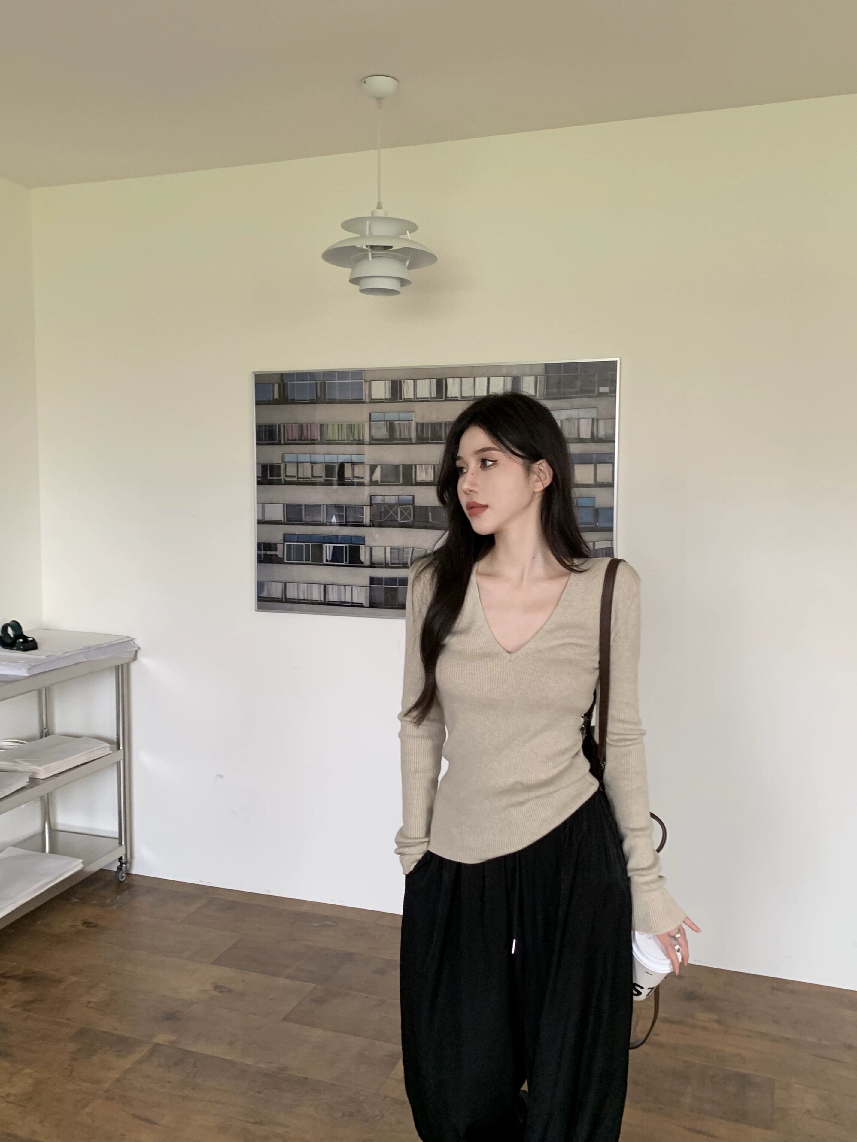 色:ミルクティーカラートップ,マイカグレートップ,黒いズボン