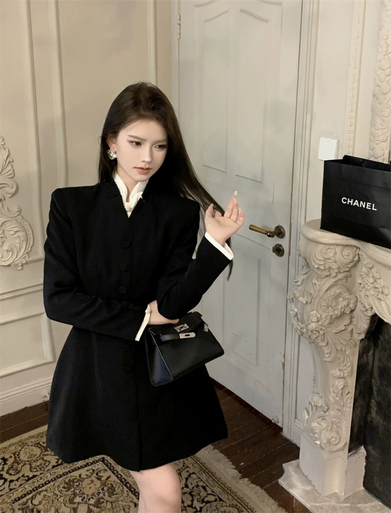 フレンチスタイルの長袖スタンドカラードレスレディース、秋のハイエンドスプライシングスカート、リトルブラックドレス、ウエストを締めるAラインスカート ロング オータム 秋物 bstraw46040885553 | beaute25