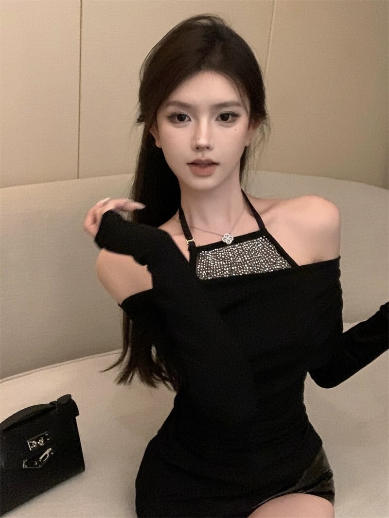 純粋な欲望スタイルのスーツ黒のワンショルダー長袖 T シャツ女性秋ダイヤモンドがちりばめられたホルターネック ベスト トップ 2 点セット ロング ブラック オータム 秋物 Tシャツ bstraw8831889056 | beaute25