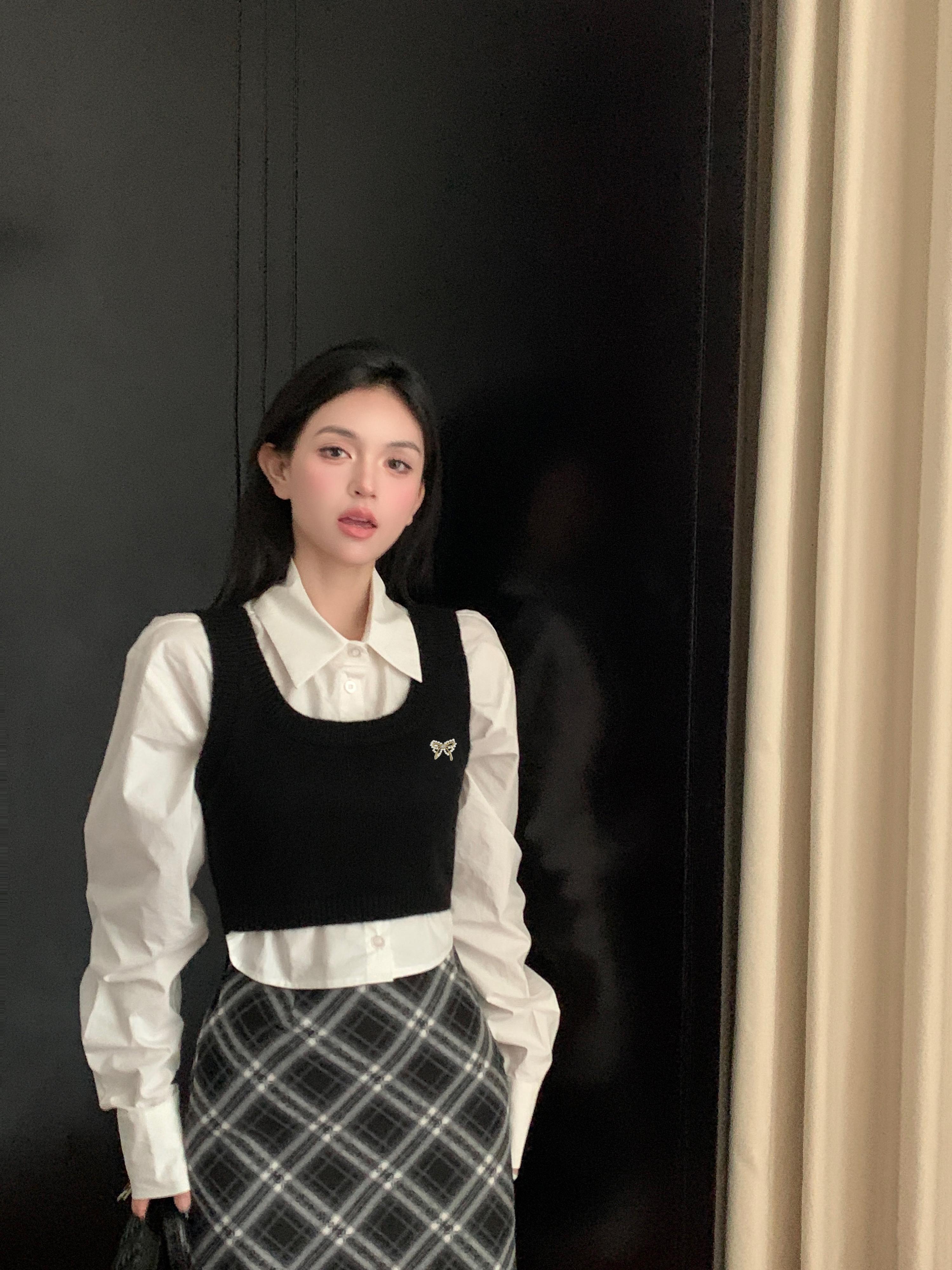 色:白のシャツ,黒のベスト,ブラウンベスト,黒のチェック柄スカート,カーキチェック柄スカート