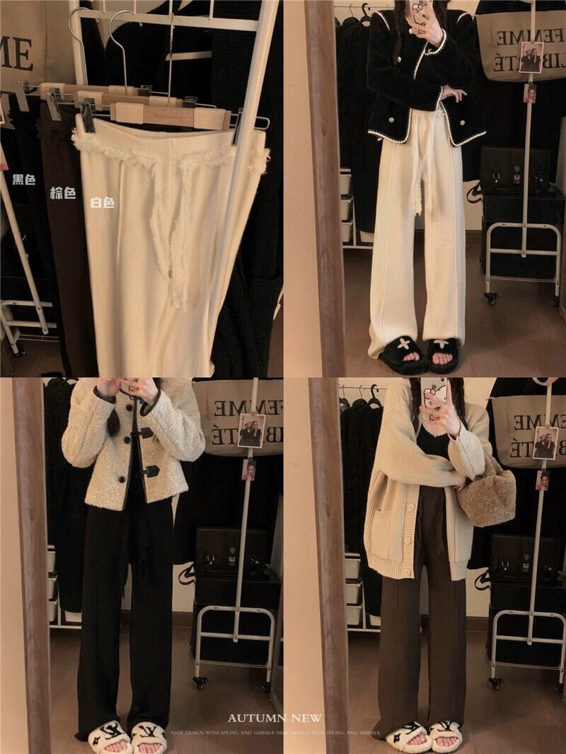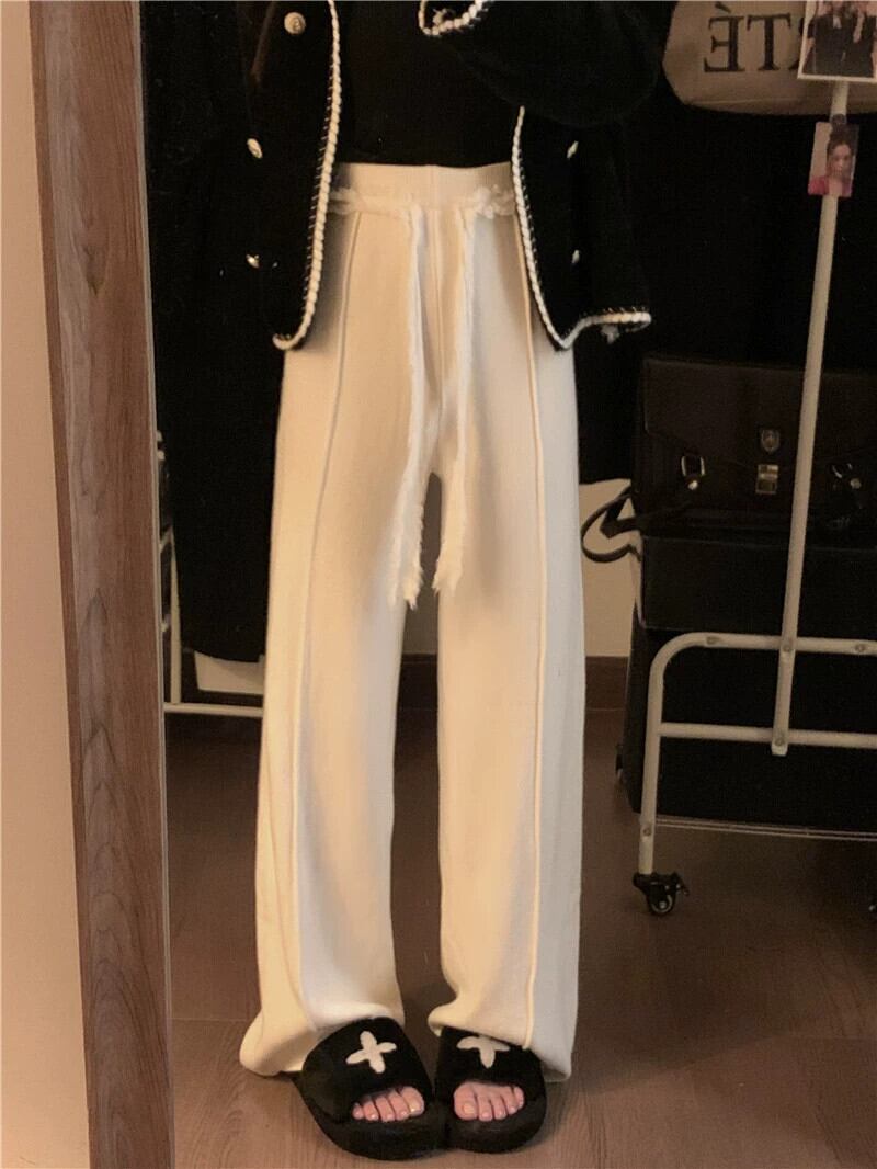 白いニットカジュアルパンツ女性の秋と冬のハイウエスト巾着ドレープストレートパンツルーズワイドレッグパンツもち米パンツ ハイウェスト ホワイト オータム 秋物 ウィンター 冬物 ワイドパンツ bstraw4038486087 | beaute25