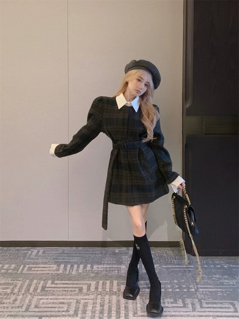 フェイクツーピーススプライスチェック柄ウールコートの女性、秋冬のレトロな気質、ウエスト付きのミドル丈、高級ウールコート オータム 秋物 ウィンター 冬物 bstraw93508097240 | beaute25