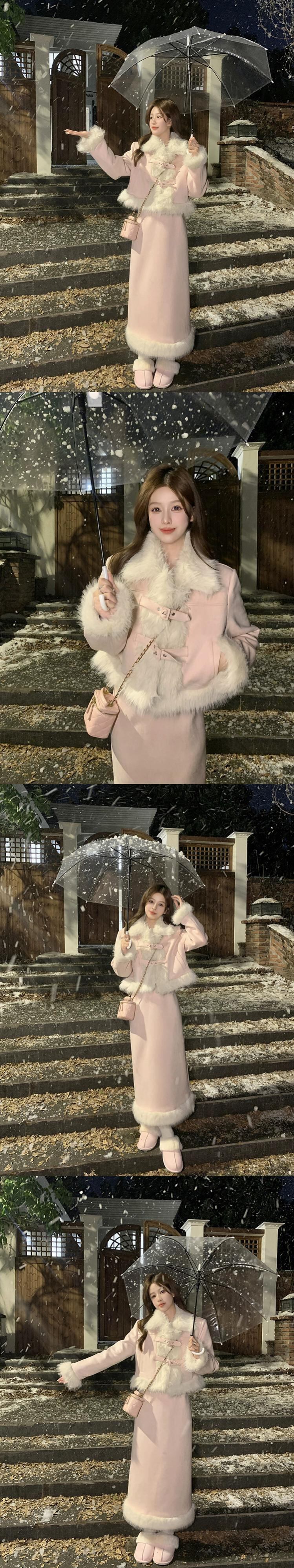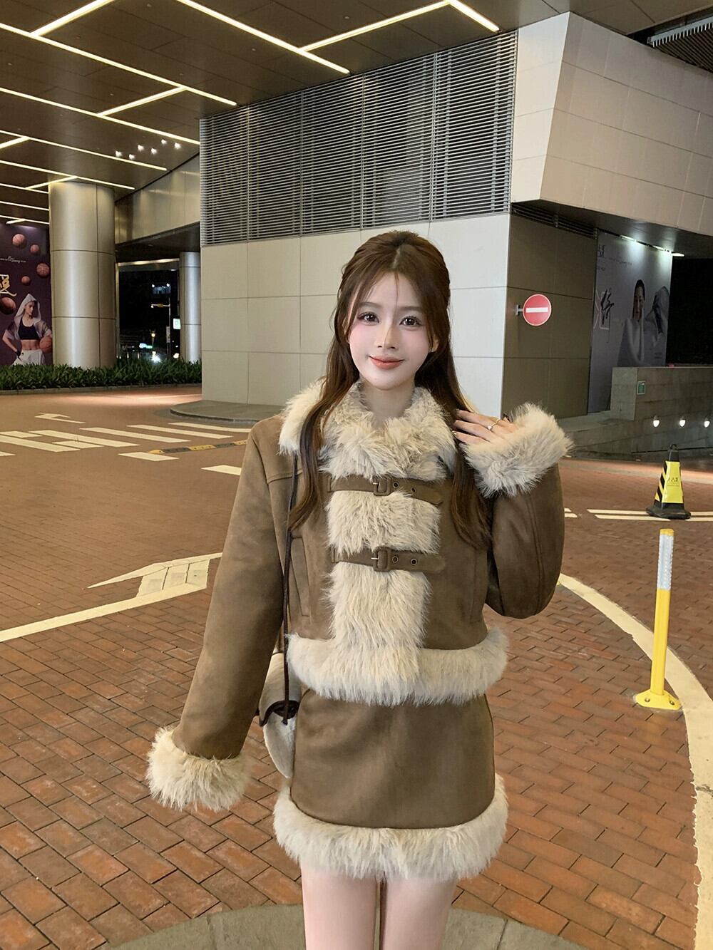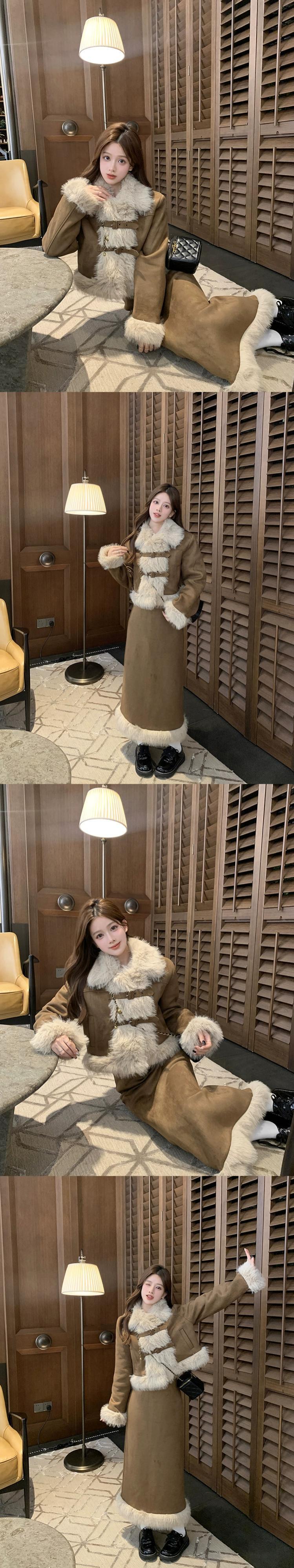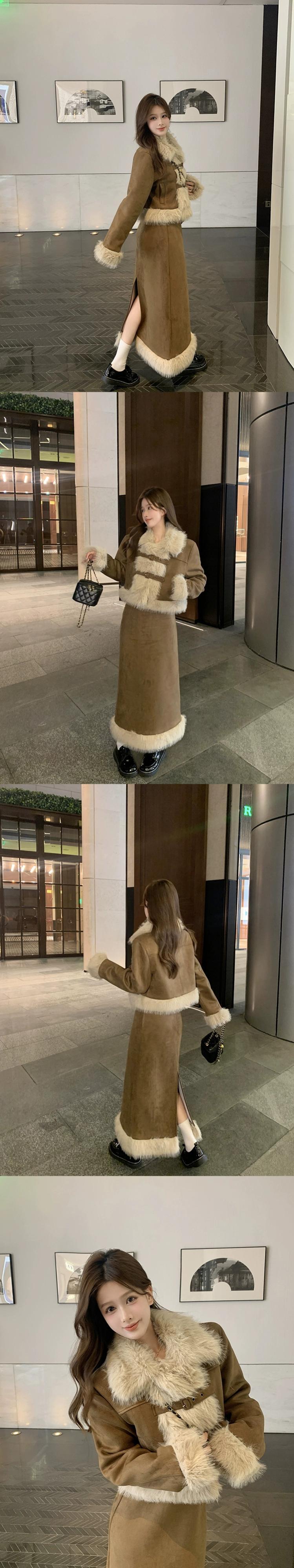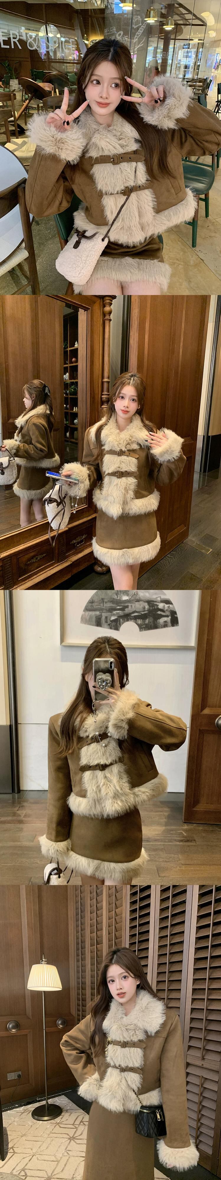 毛皮のような襟パッド入りスエードジャケットメイラード衣装スーツ女性の冬のハイウエストスカート気質ツーピースセット スウェード ウィンター 冬物 bstraw55773787298 | beaute25