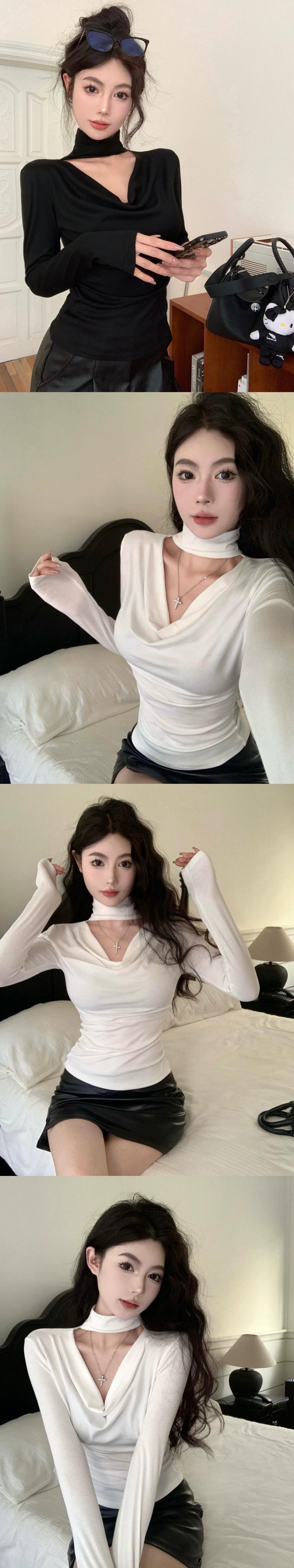 秋のデザインのピンクのスイングカラー長袖 T シャツの女性、純粋な欲望のスタイル、セクシーで優しい、インナー トップ付きスリムフィット ボトリング シャツ ロング オータム 秋物 Tシャツ ピュア bstraw25802242523 | beaute25