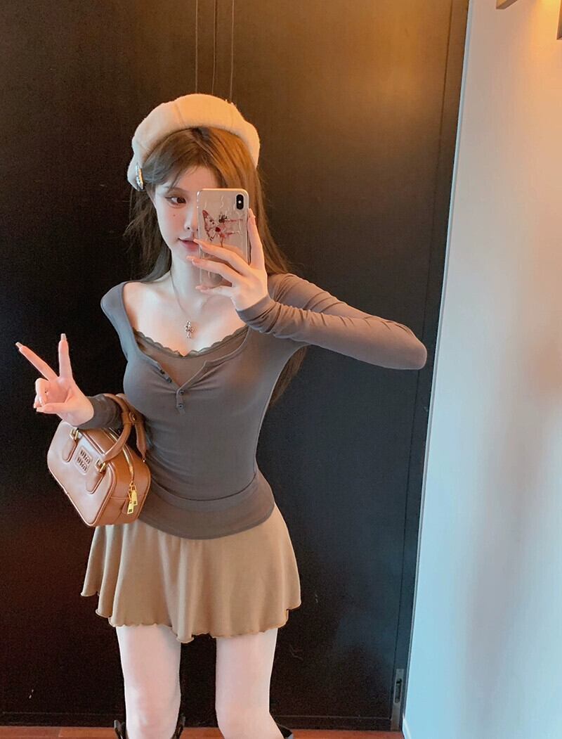 偽のツーピースレーススプライシングスリム長袖 Tシャツ女性の秋と冬の純粋な欲望スタイルセクシーなインナーウェアタイトな底シャツトップ ロング オータム 秋物 ウィンター 冬物 ピュア bstraw19880598718 | beaute25