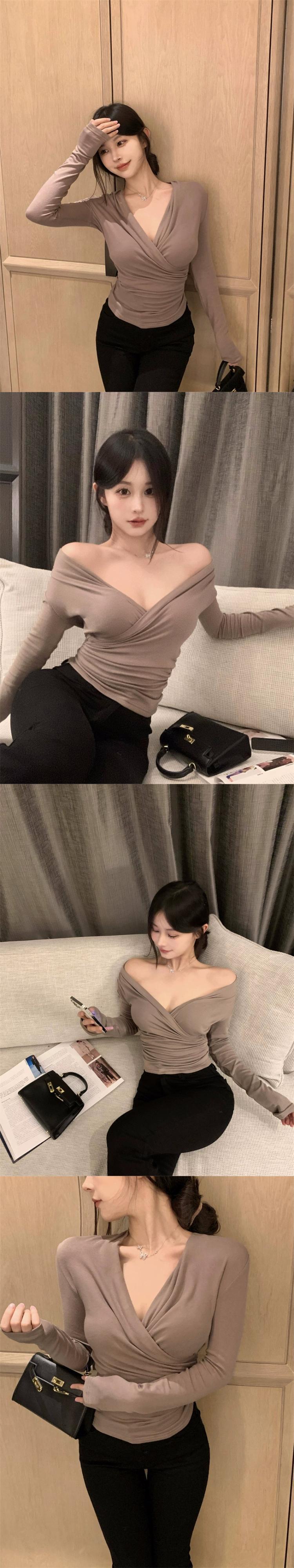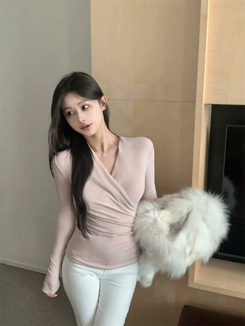 秋と冬のピンクのクロスディープ V ネック長袖 T シャツの女性、タイトなインナー レイヤリング シャツを備えたスリムフィットのショート 甘辛トップス ロング 大人ガーリー スウィート キュート カジュアル オータム 秋物 ウィンター 冬物 Vネック Tシャツ bstraw90412248904 | beaute25