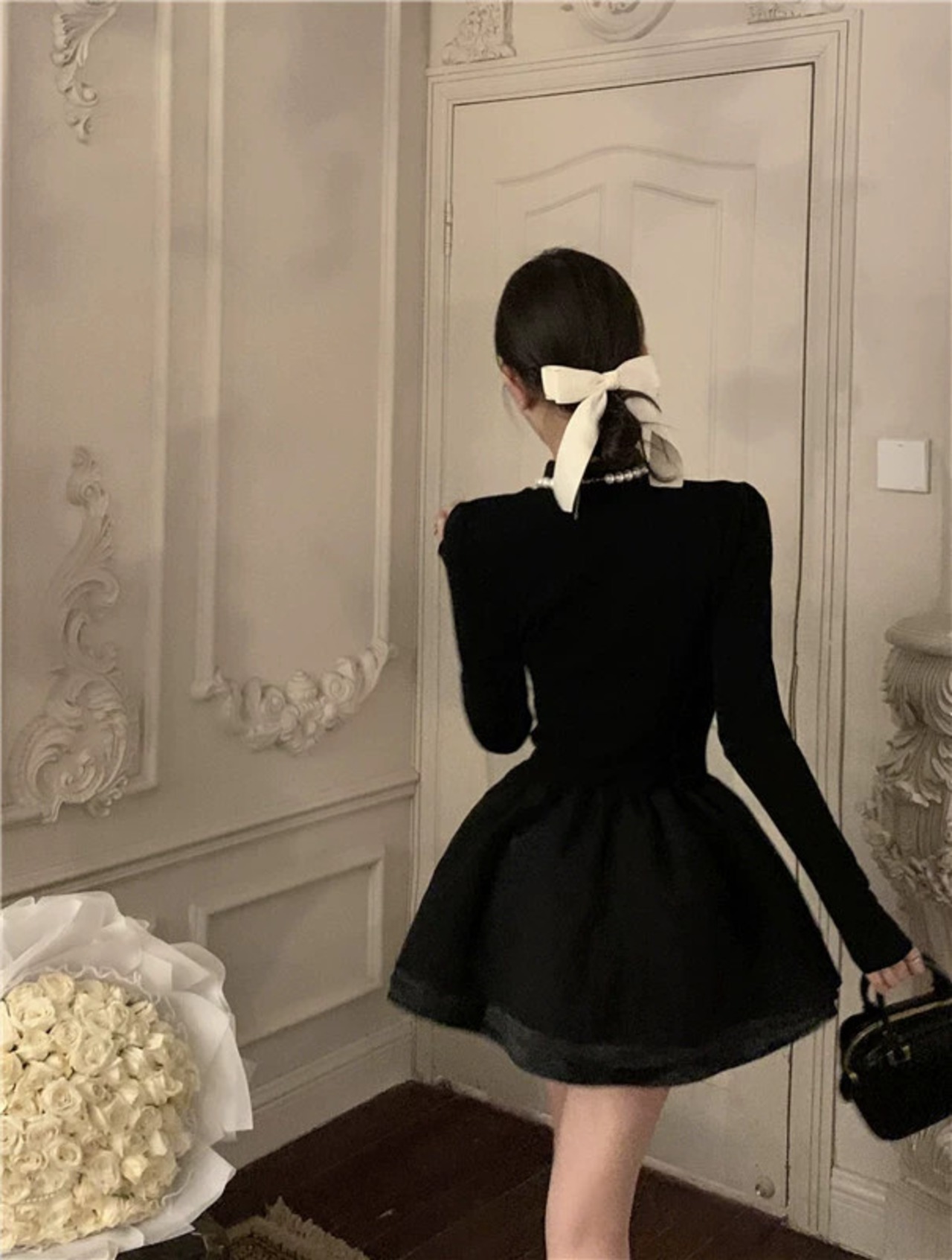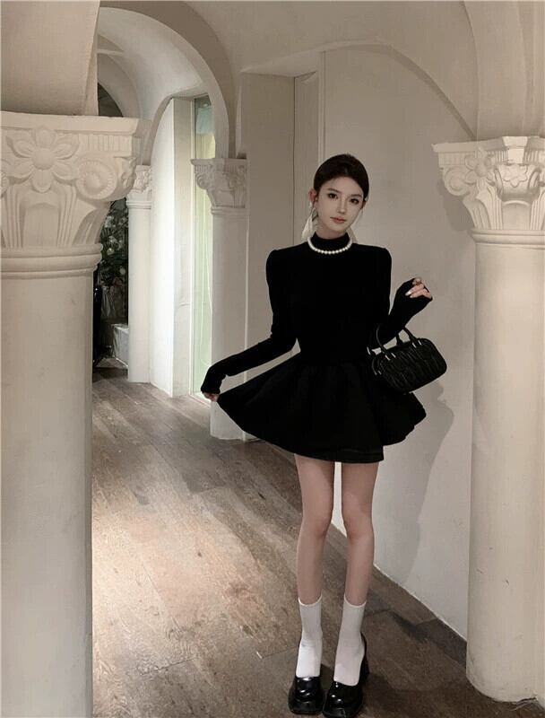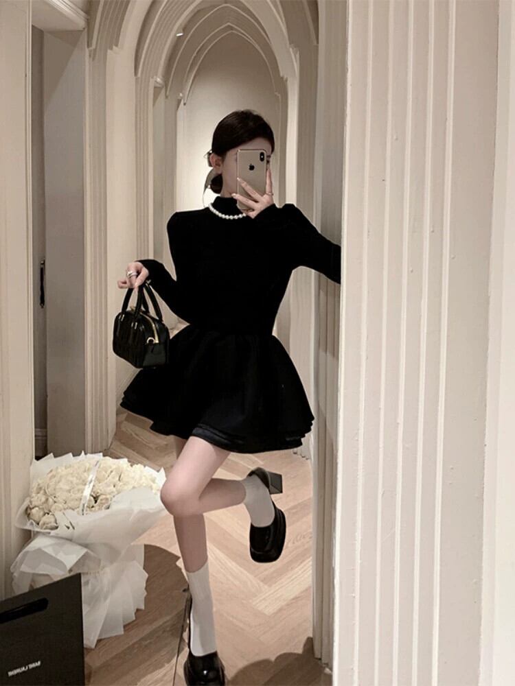 秋と冬の黒のハーフハイカラーのニットドレスの女性、ウエストを締めるAラインのチュチュスカート、底に小さな黒いスカートが付いた短いスカート ショート ブラック オータム 秋物 ウィンター 冬物 パニエ ペチコート bstraw75780219818 | beaute25