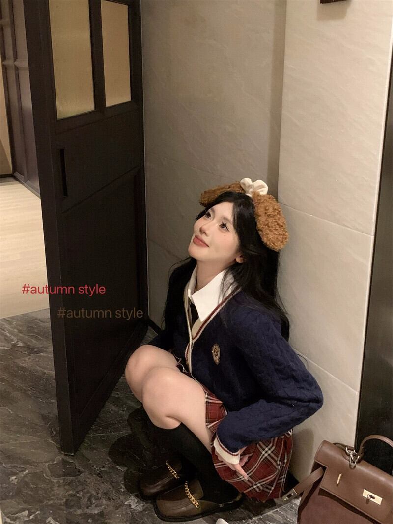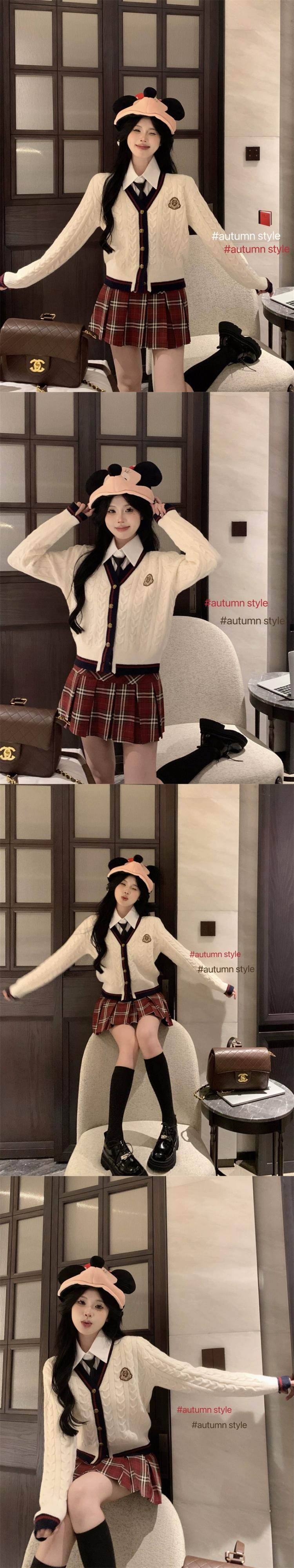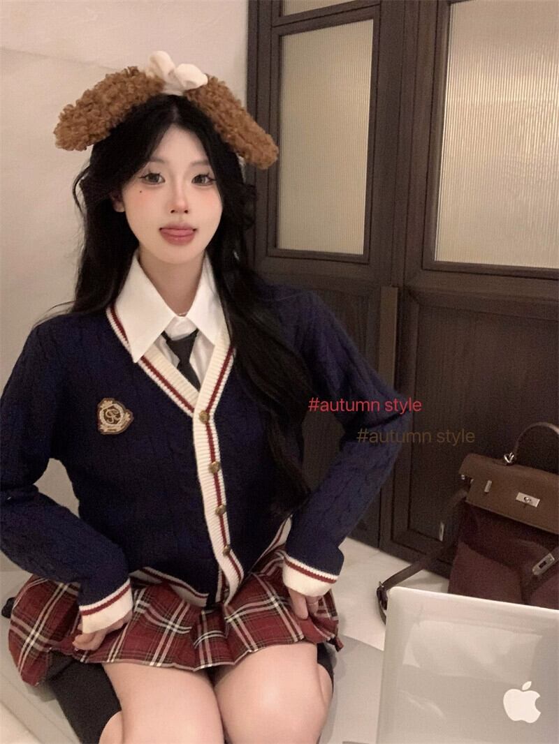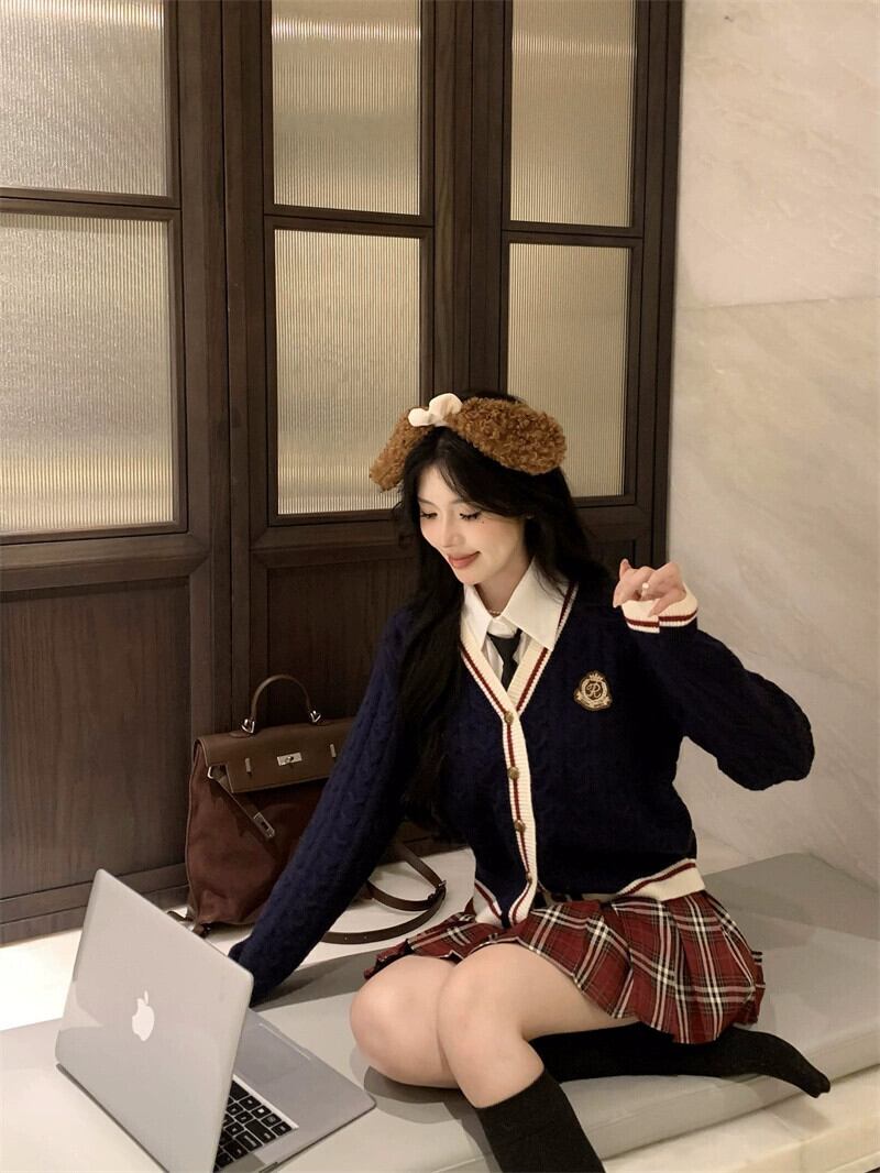 色:チェック柄スカート,ネクタイ付きシャツ,白いカーディガン,ブルーカーディガン